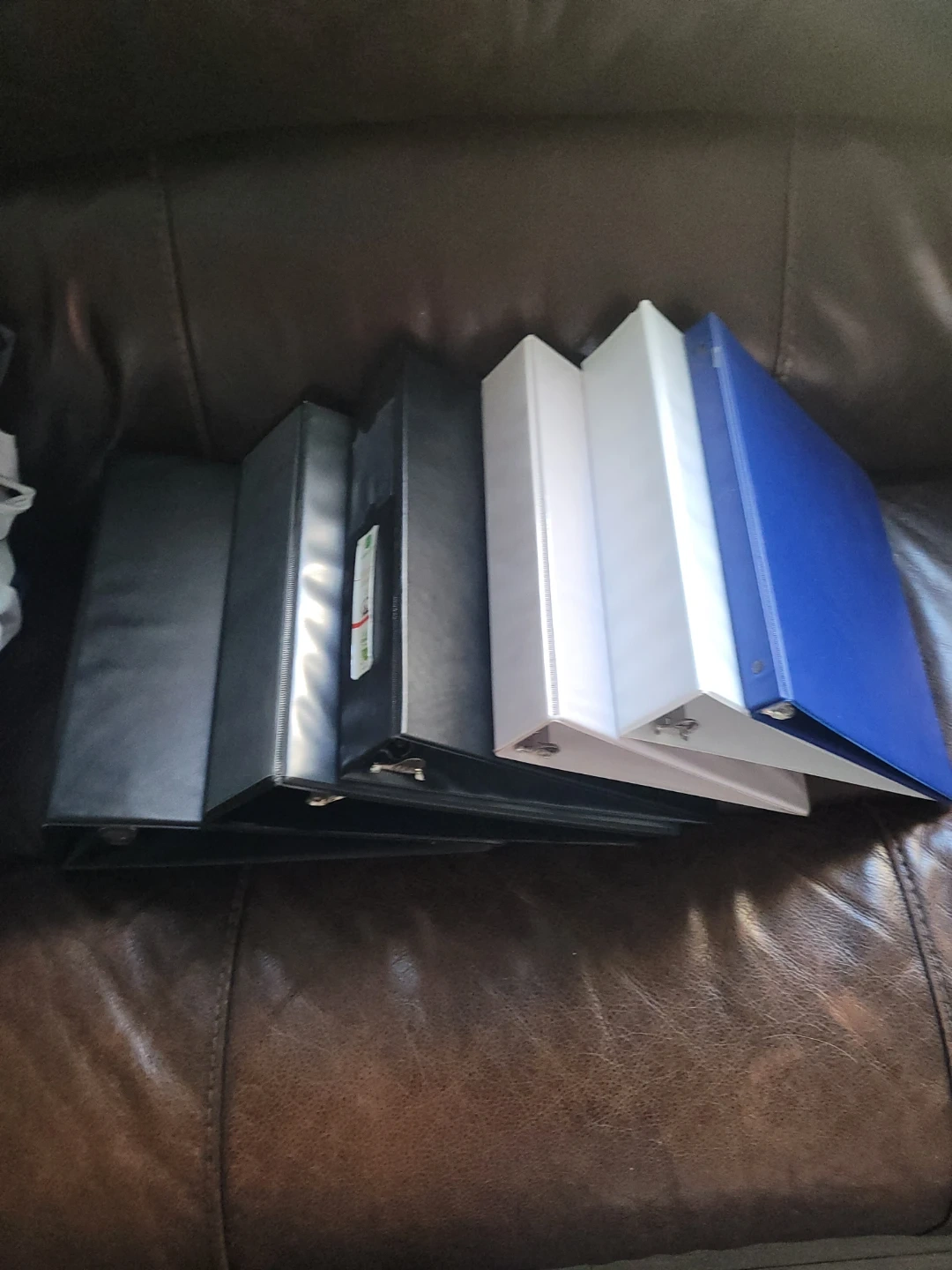 This set includes six binders in various colours, including black, white, and blue. They're all standard binders suitable for organizing documents. These binders are perfect for home or office use!
