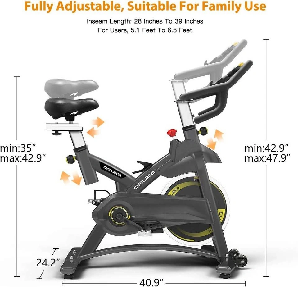 This Cyclace exercise bike provides stable, quiet, and safe cycling. It features a thickened steel triangular frame, a 36lbs flywheel, and a belt-driven system, supporting up to 330lbs for smoother rides than chain-driven bikes. It's a great choice for a home gym. Riding can help burn fat quickly, build core muscles, and strengthen your heart with reduced injury risk. The multi-grip handlebar and adjustable resistance suit beginners to professionals. This indoor machine is fully adjustable for family use, with an extended adjustable seat post, a 2-way adjustable non-slip handlebar, and a 4-way adjustable seat (fits inseams 28-39”). Wheels make it easy to move. The LCD monitor tracks time, speed, distance, calories burned, and odometer. Place your phone on the holder to watch videos while you ride. The comfortable seat cushion allows for longer workouts.
