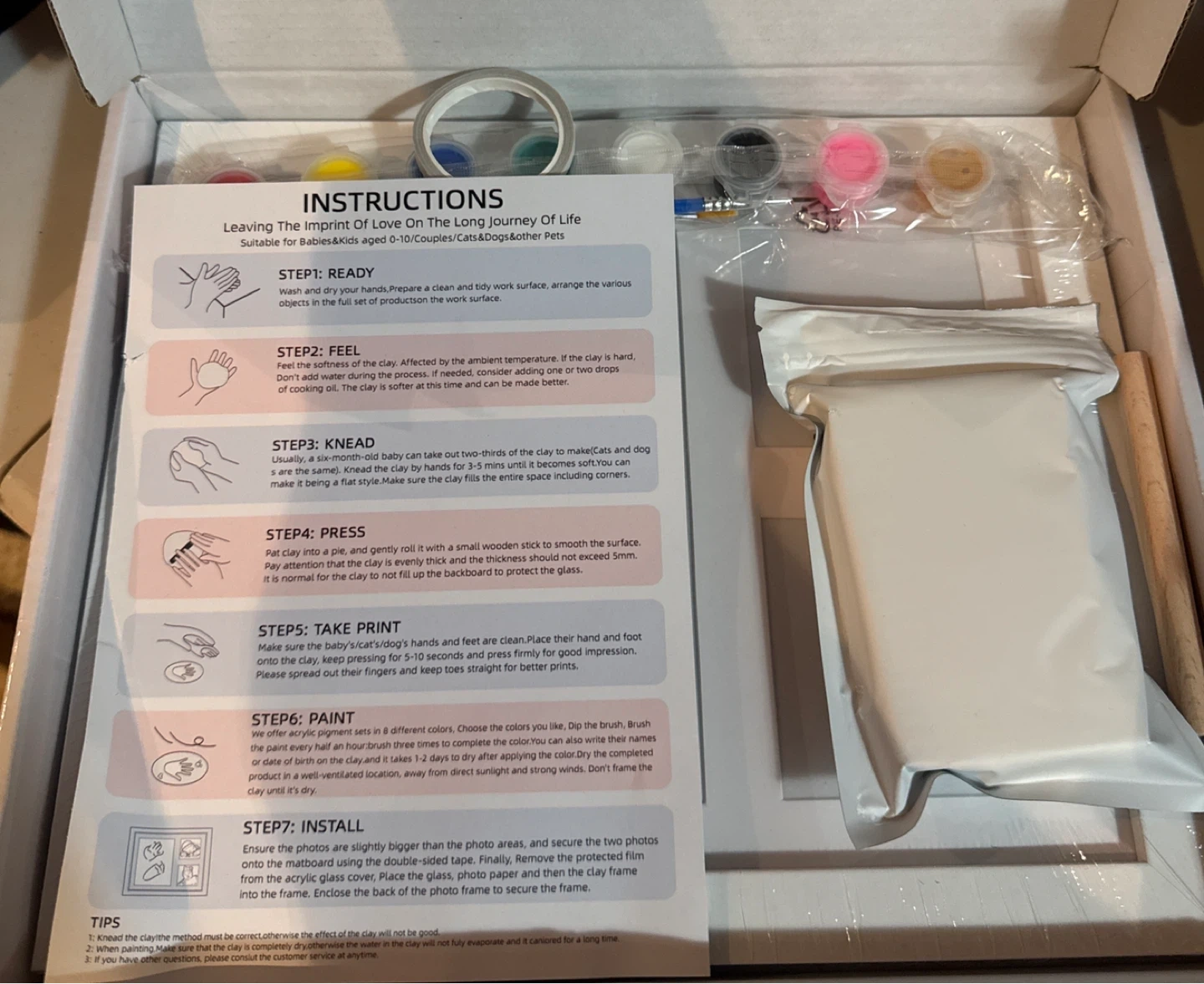 This kit lets you create a lasting memory of your baby's tiny hands and feet. It includes clay, paint in 8 colours, and brushes for personalization. Instructions are provided for easy use. Suitable for babies and kids, couples, and pets.