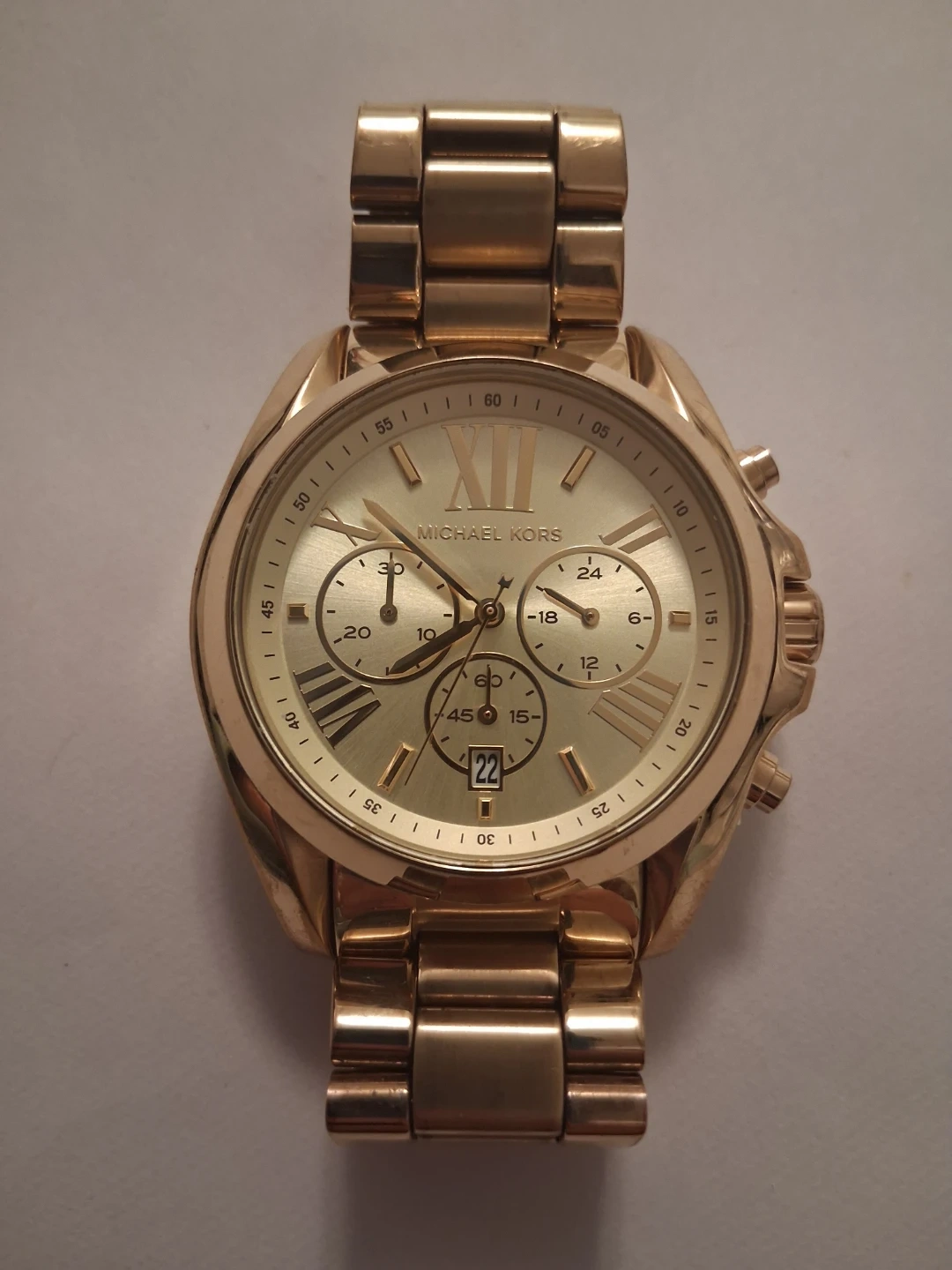 This is a gold Michael Kors watch. It features Roman numerals on the face and a date window. The watch has a chronograph function. Battery NOT included.