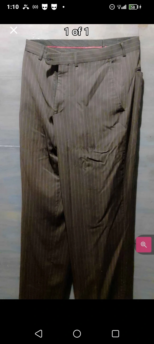 Men's brown pinstripe dress pants. Classic fit with belt loops and button closure. Suitable for business or formal occasions.