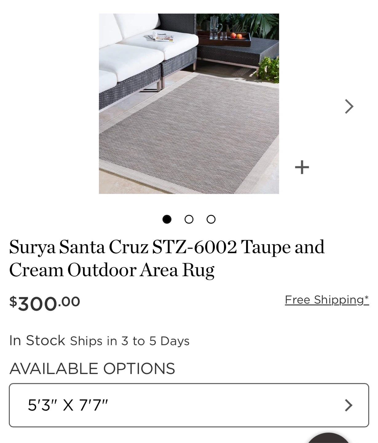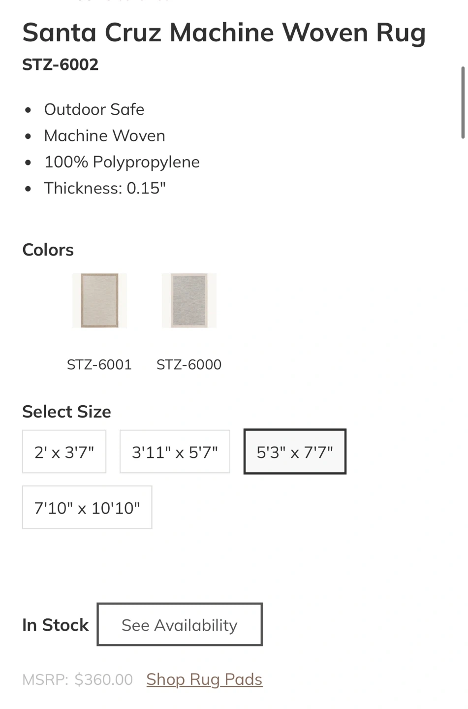 Surya Santa Cruz STZ-6002 outdoor area rug. Machine woven with 100% polypropylene. Thickness is 0.15". This rug is outdoor safe and measures 5'3" x 7'7".