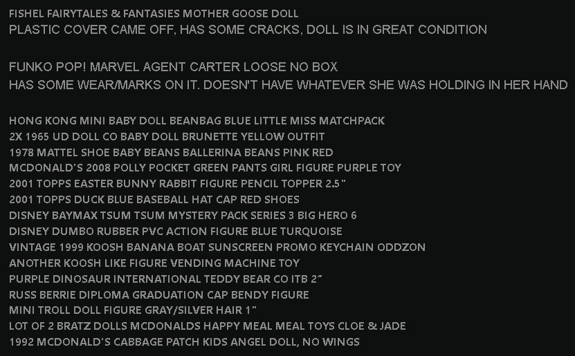 Selling a vintage Fishel Fairytales & Fantasies Mother Goose doll! and other dolls and figures. Bratz doll vintage little baby dolls Dumbo figure Russ Berry a mini troll and others. These collectible dolls are a charming addition to any collection. full list on last picture. pick up at house