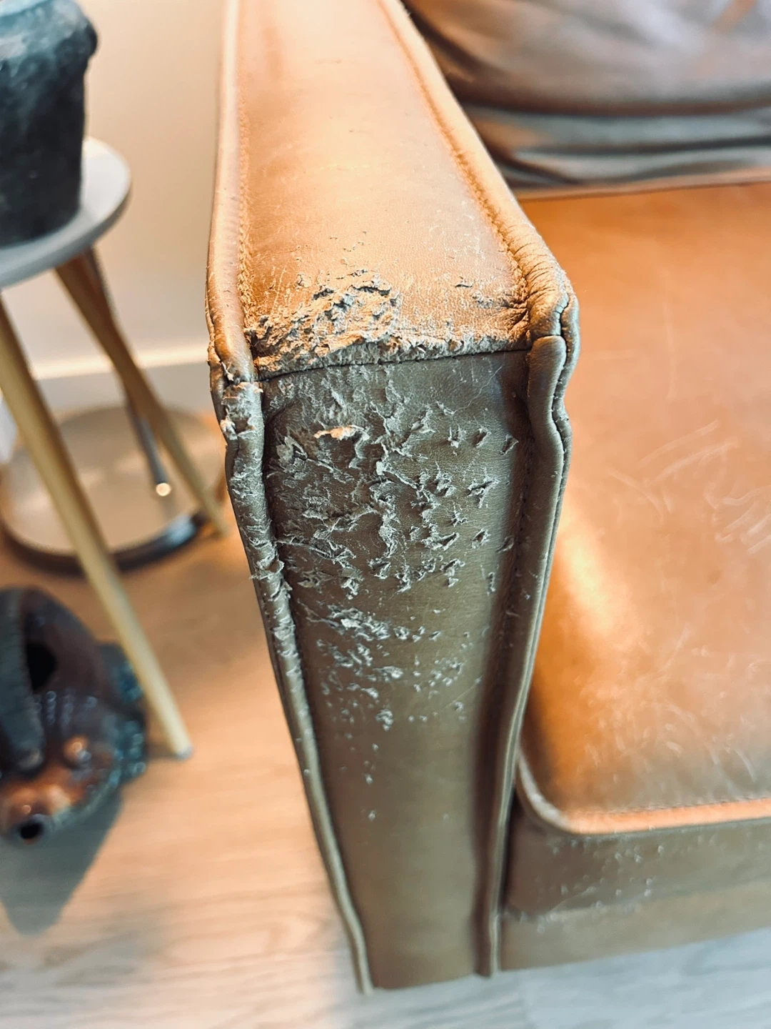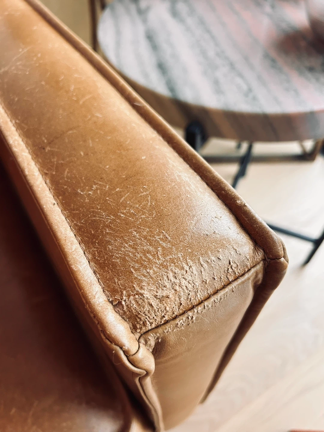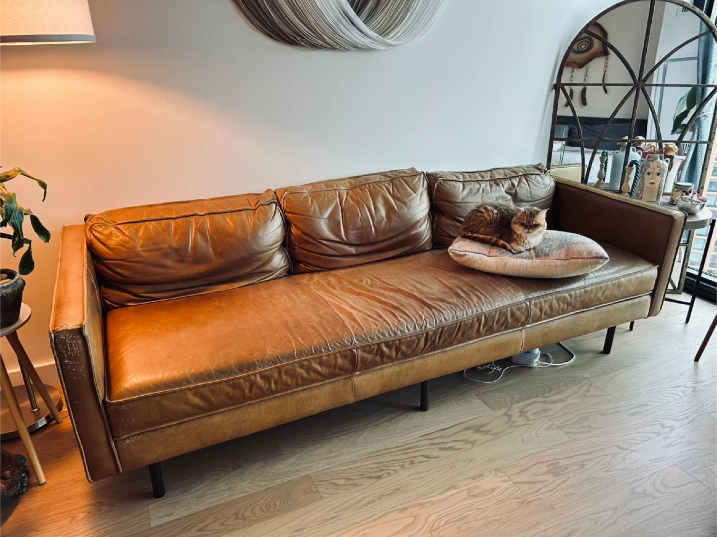 10Selling a leather sofa that has some wear and tear, as shown in the pictures. Still has a lot of life left and is very comfortable and durable. Genuine top-grain leather. Leather is a natural product. Variation in color and texture are inherent to each hide; no two pieces are exactly alike. Metal legs in a Burnished Bronze finish (legs are removable). High-gauge sinuous springs provide cushion support. Seat cushion has fiber-wrapped, high-resiliency polyurethane foam core. Seat firmness: On a scale from 1 to 5 (5 being firmest), it's a 4. Back cushions are fiber filled. Overall: 89"w x 36"d x 34.3"h Seat width: 81" Seat depth: 21.3" Seat height: 19.3" Back height: 26.4" Arm height: 26.4" Leg height: Diagonal depth: 21" $2,899 retail $450 - make an offer Greenpoint Brooklyn