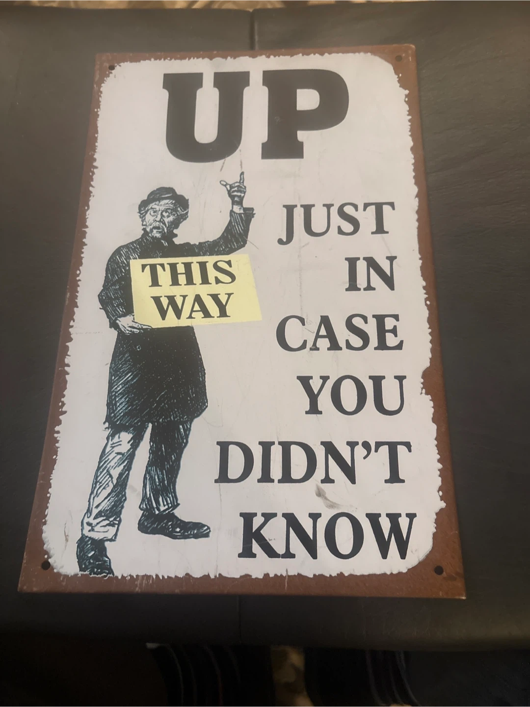 π This retro metal sign features a sketch of a man pointing the way. It reads "UP THIS WAY JUST IN CASE YOU DIDN'T KNOW." It's a fun piece for your home or garage! It's made of tin with a slightly distressed finish.