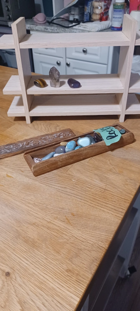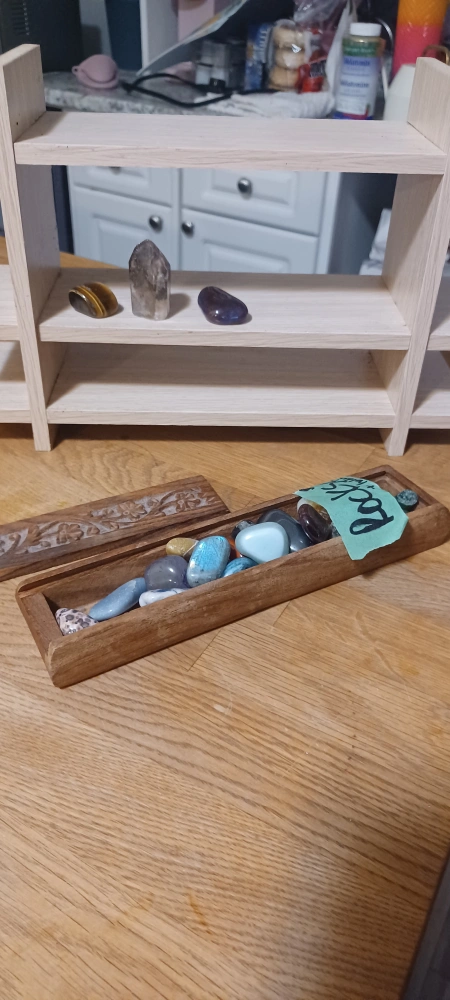 Crystals and Carved Wooden Box, and rock shelf!
