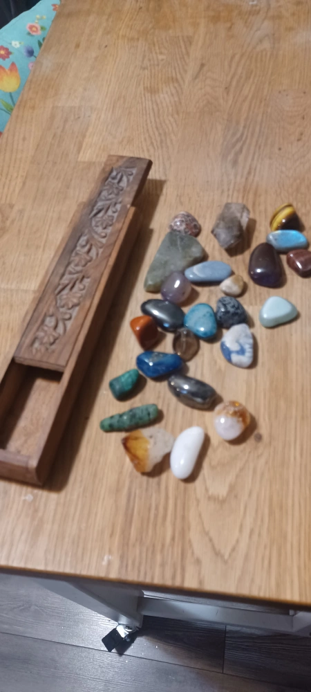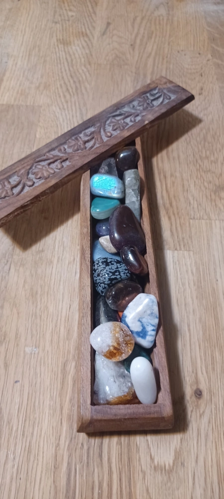 A collection of crystals in a carved wooden box. The box is intricately carved with a floral pattern. The crystals are of various colours and sizes.