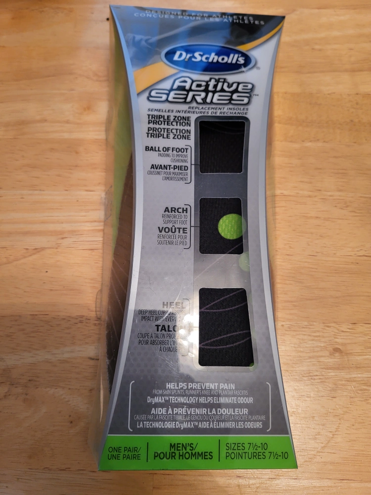 Replacement insoles. Designed for all-day comfort and support. Features triple zone protection. Helps prevent pain caused by plantar fasciitis. Absorbs shock. Eliminates odour. One pair, men's sizes 7-10. Never used.