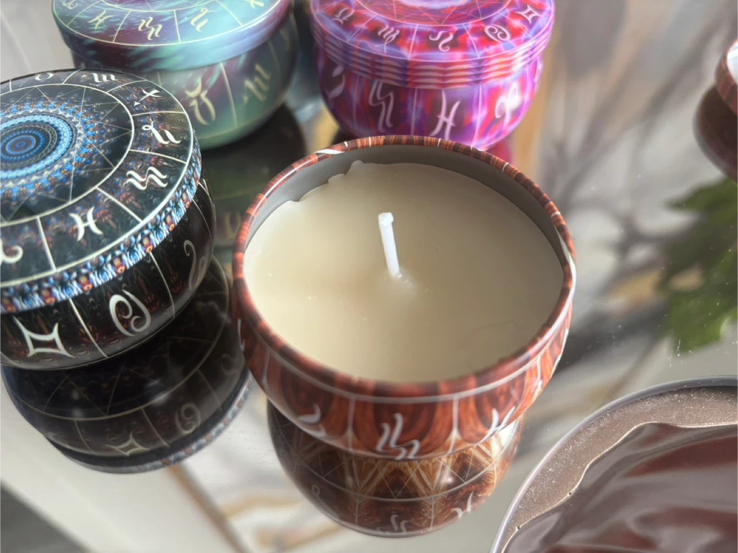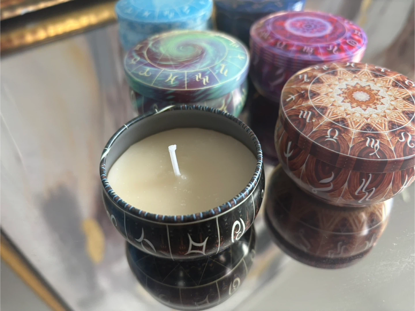This is a set of six small tin candles, each featuring a unique zodiac-themed design. They're great for creating a cozy atmosphere. Designs include various astrological symbols and patterns.