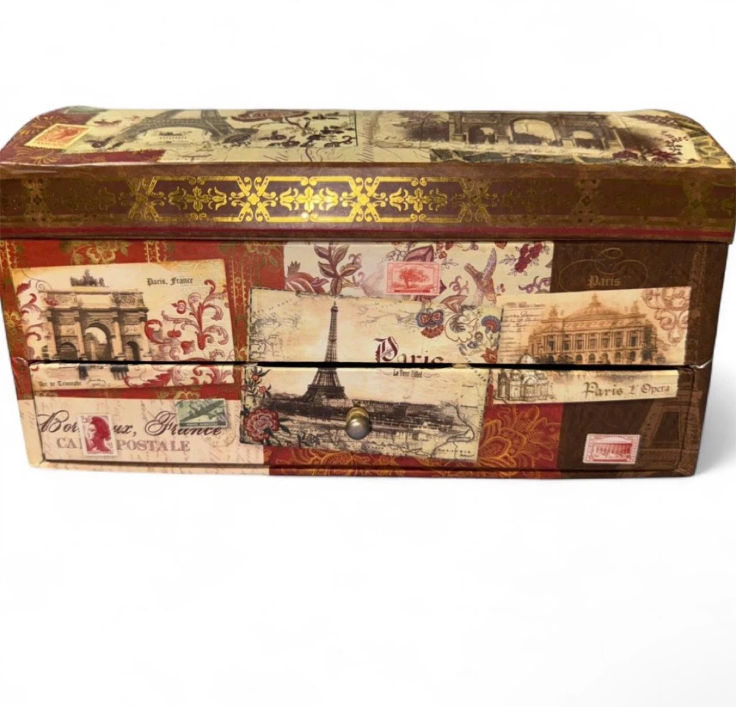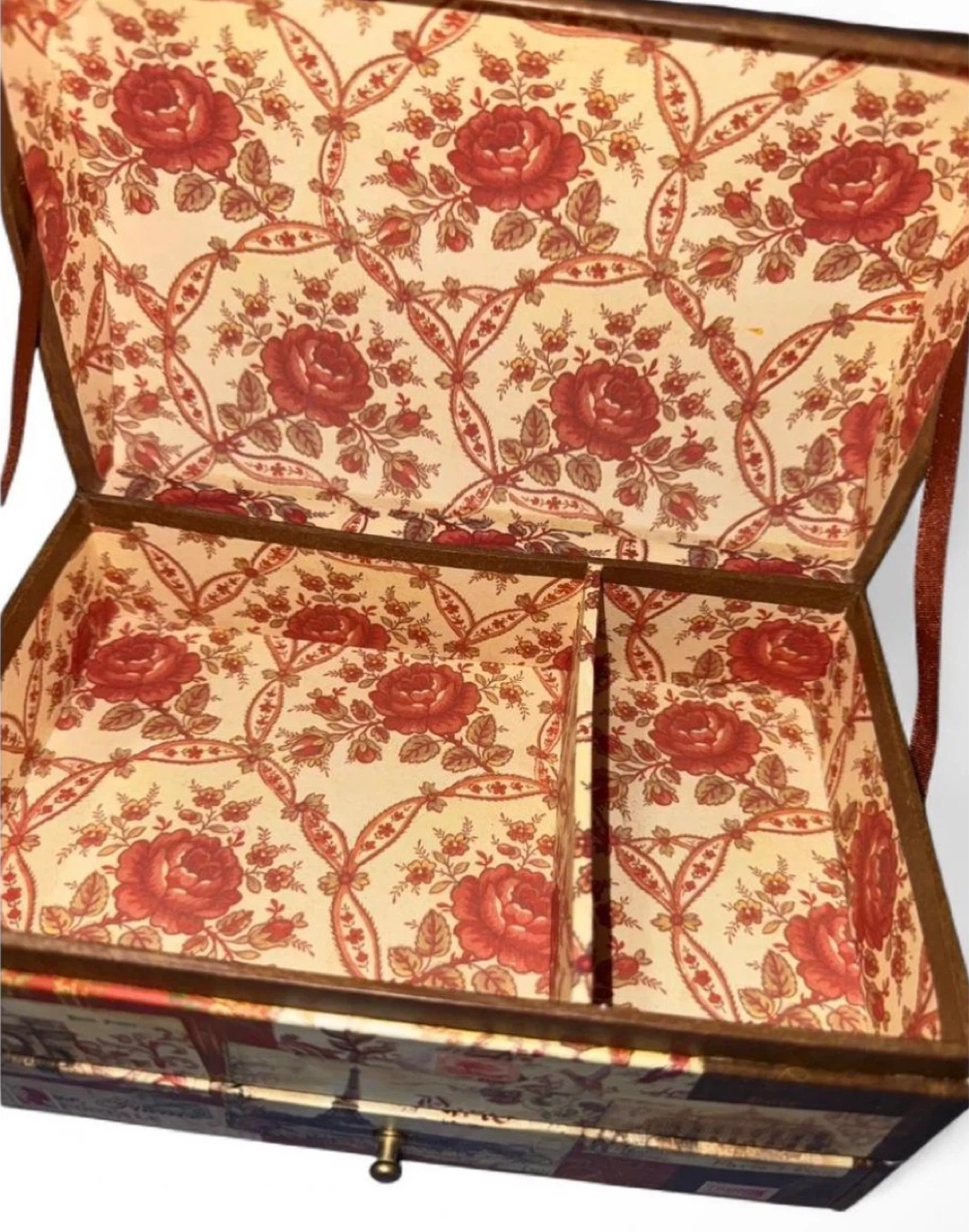 Charming decorative jewelry box featuring a lovely rose floral print lining and a vintage Paris postcard-style exterior. It has two small drawers at the bottom for extra storage. Perfect for keeping jewelry organized!