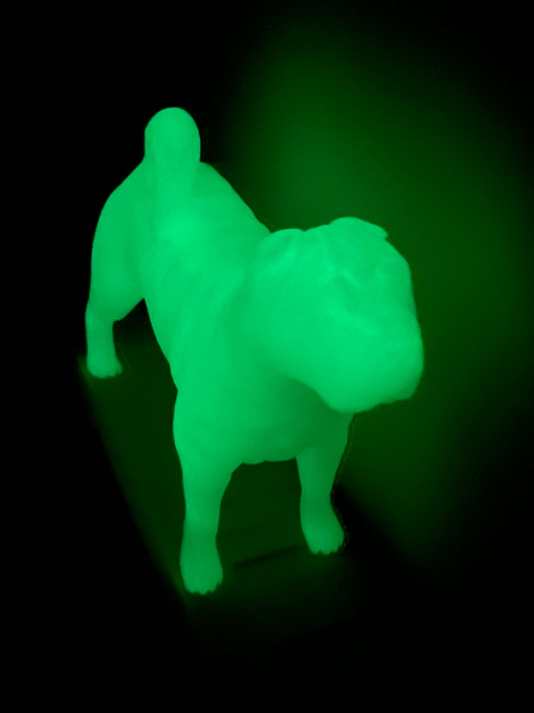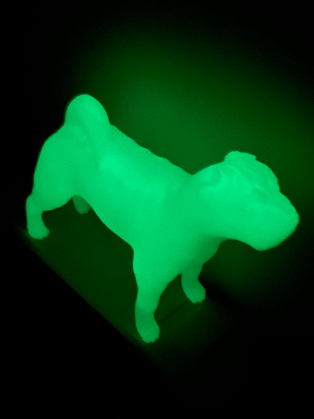 Here's a cute 3D printed figurine of a Shar Pei dog! It's a unique little piece that would look great on a desk or shelf. The figurine has a smooth texture and a charming design. It also glows in the dark!
