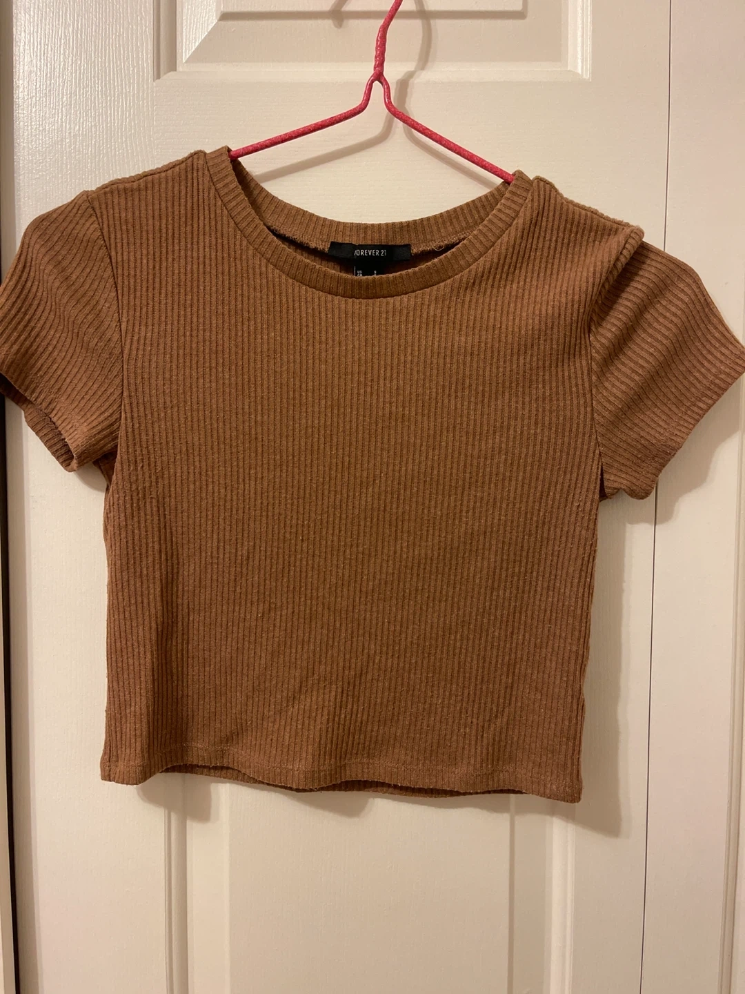 Selling a cute brown ribbed crop top from Forever 21! It's a size small and in great condition. Perfect for layering or wearing on its own!