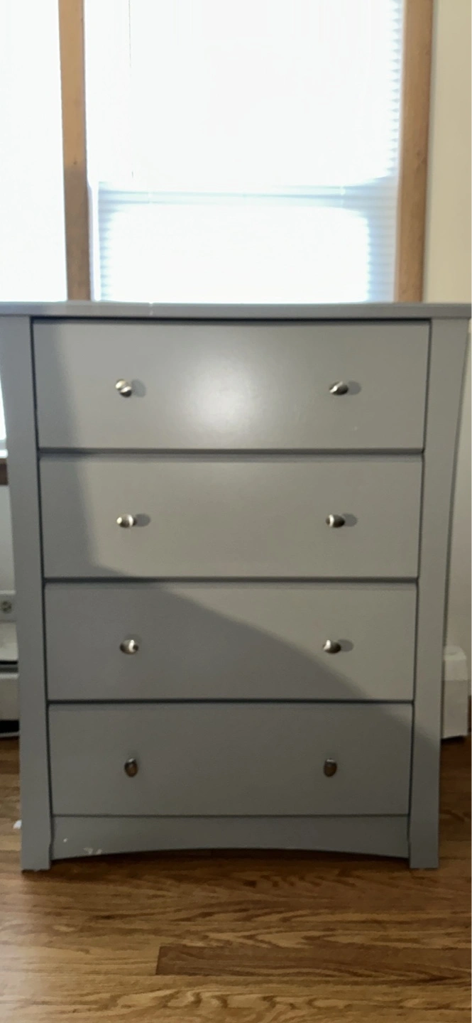 Four-drawer dresser. Pebble gray color. Silver knobs. Good condition.