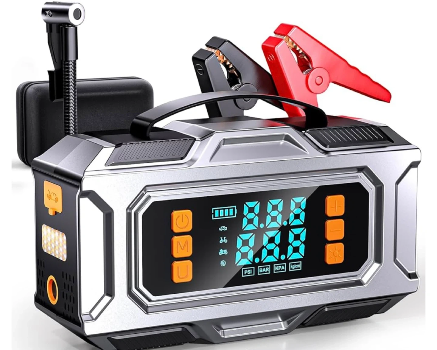 This is a portable jump starter and tire inflator. It features a digital display for pressure readings in PSI, BAR, KPA, and kg/cm. It includes jumper cables and a tire inflator hose.