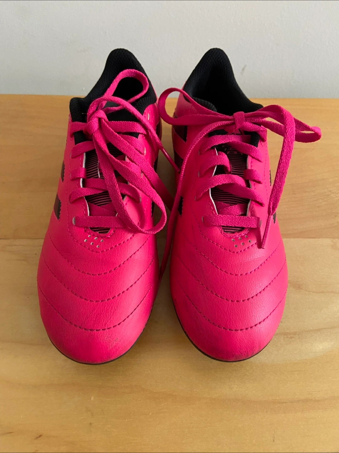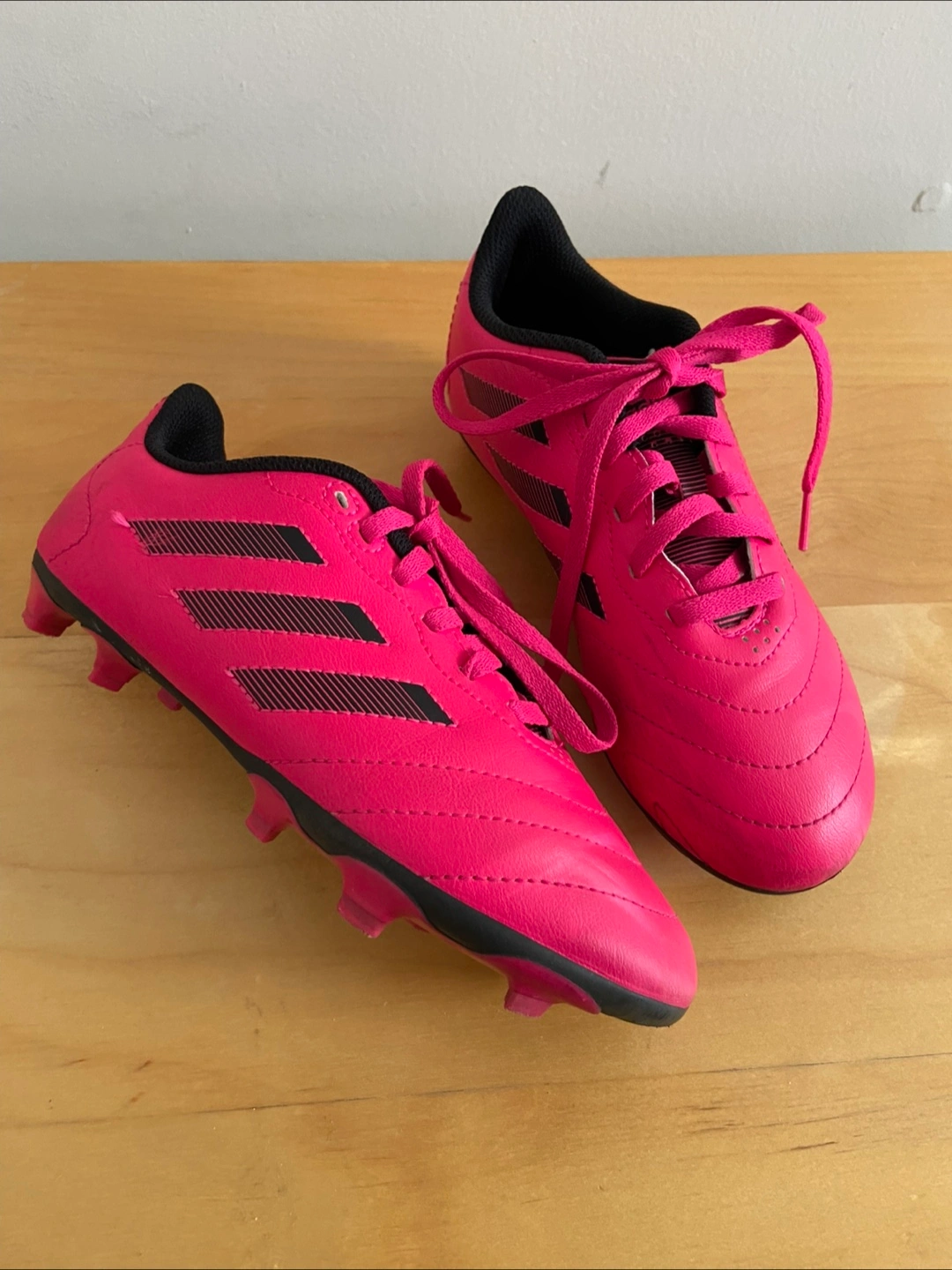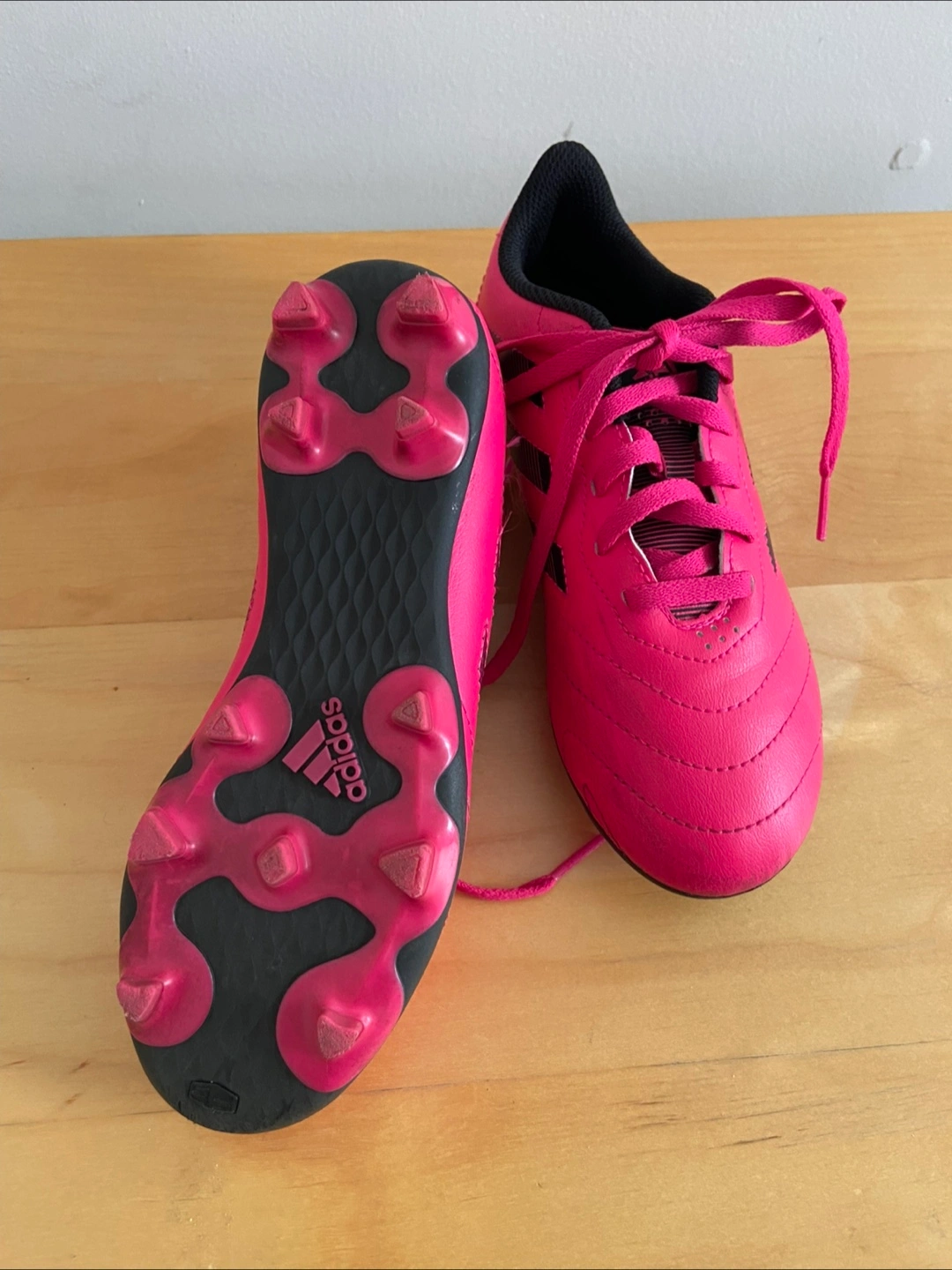 Selling a pair of Adidas soccer cleats in a vibrant pink color! These cleats feature the classic Adidas stripes in black and are perfect for the soccer field. They are in great shape and ready for a new owner to score some goals!