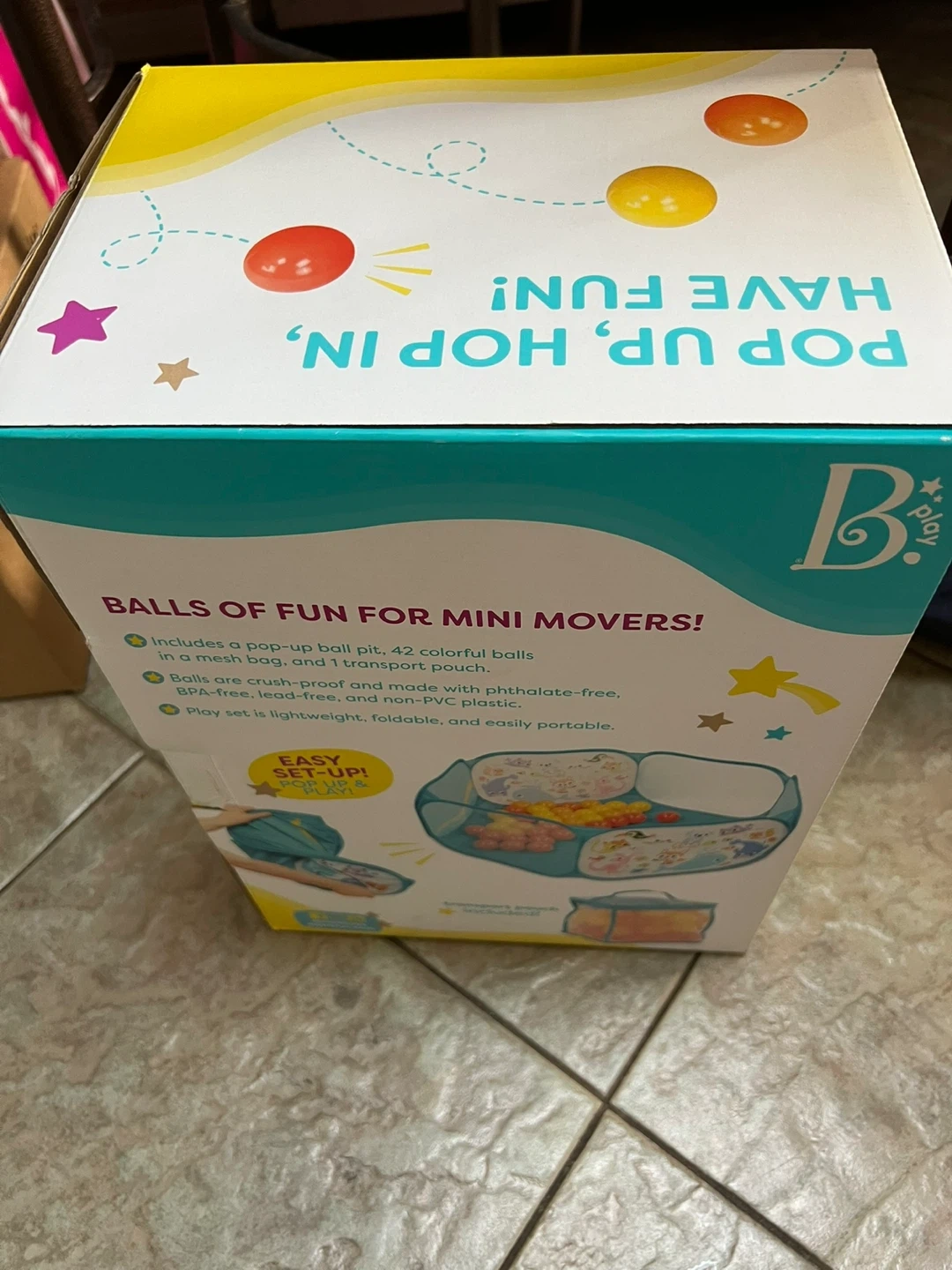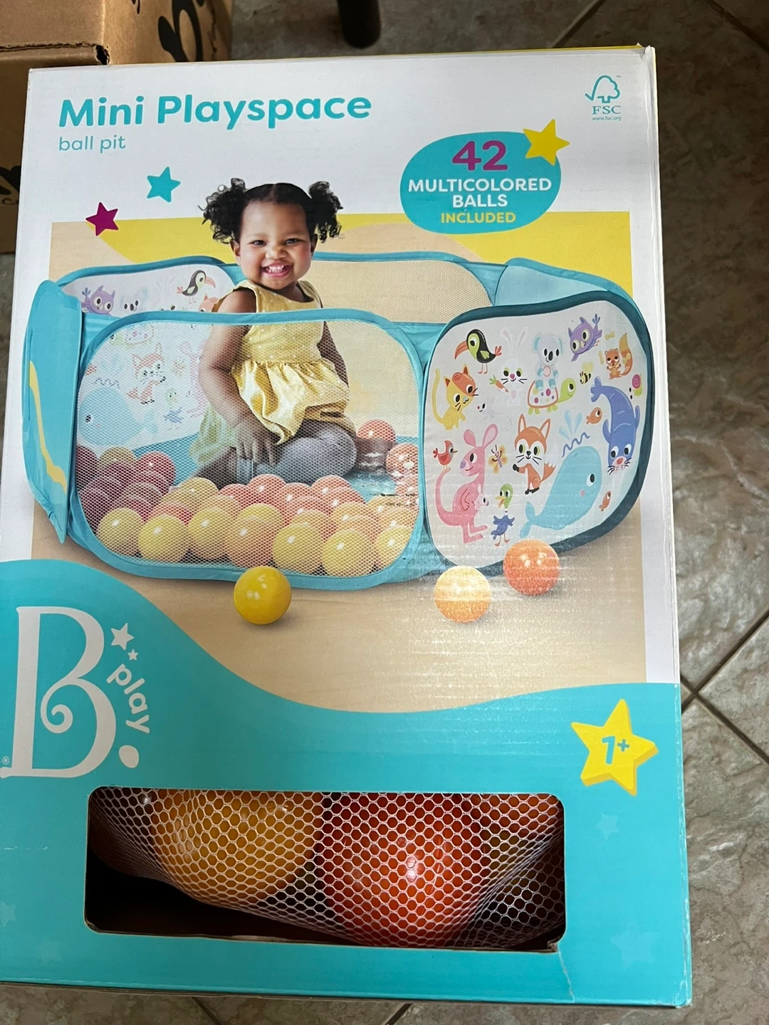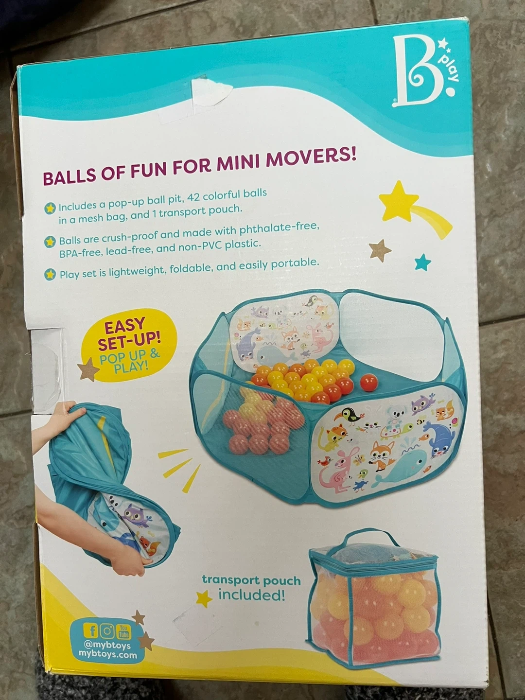 Selling a brand new B. play Mini Playspace ball pit! It includes 42 colorful balls in a mesh bag and a transport pouch. The balls are crush-proof and made with phthalate-free, BPA-free, lead-free, and non-PVC plastic. The play set is lightweight, foldable, and easily portable