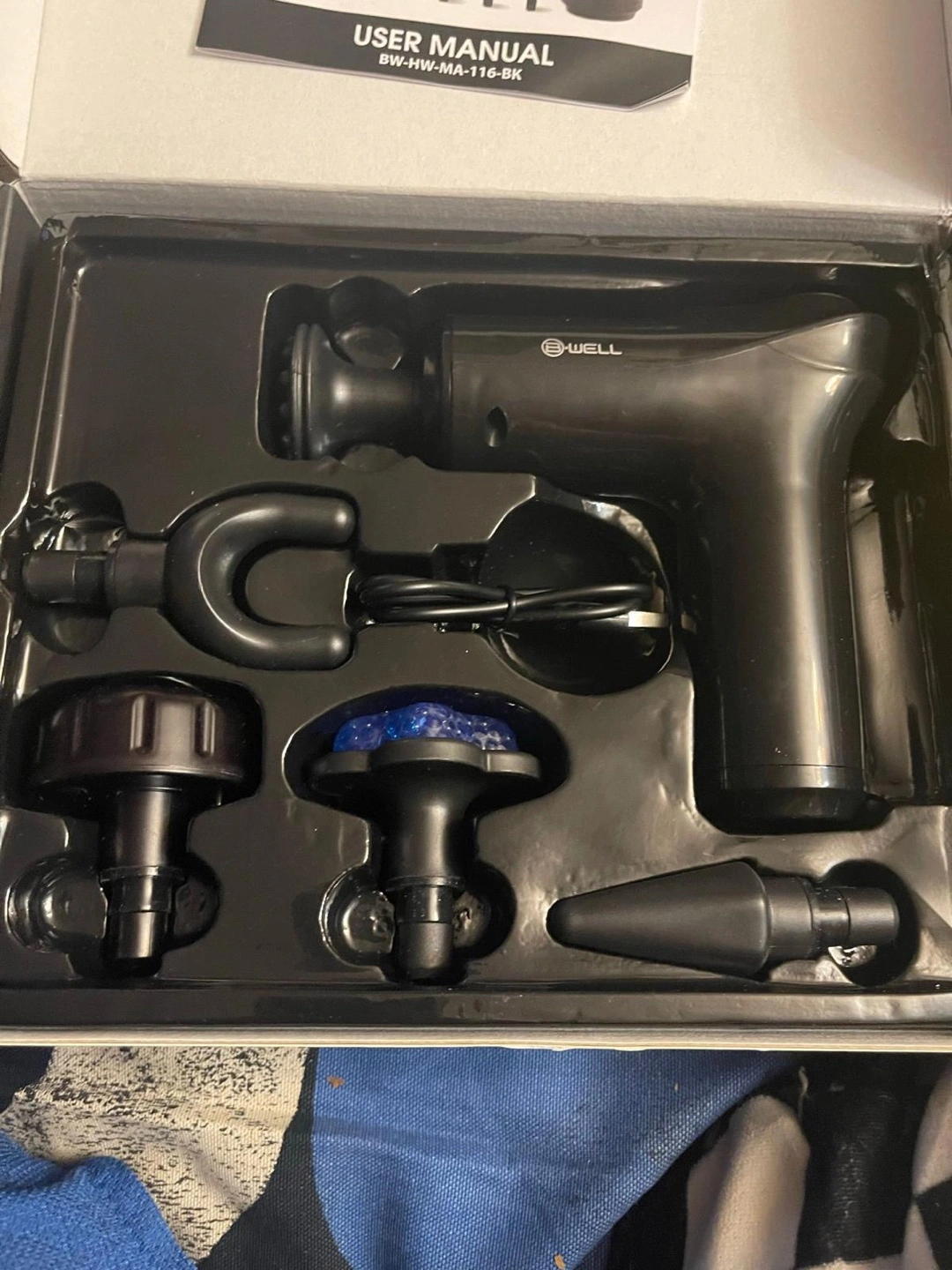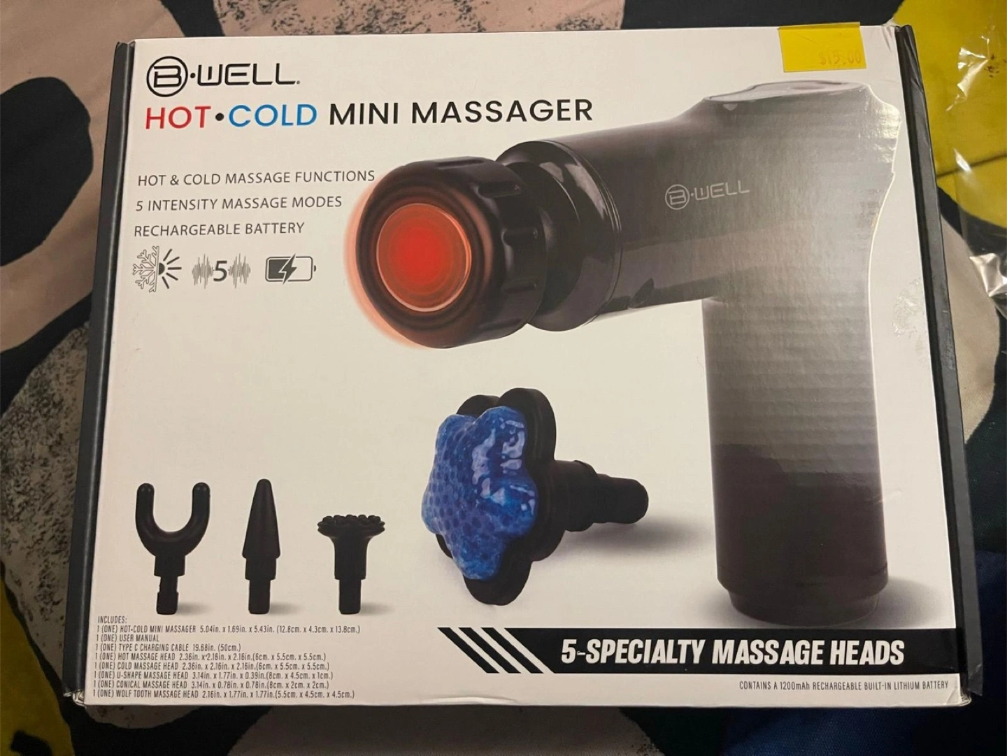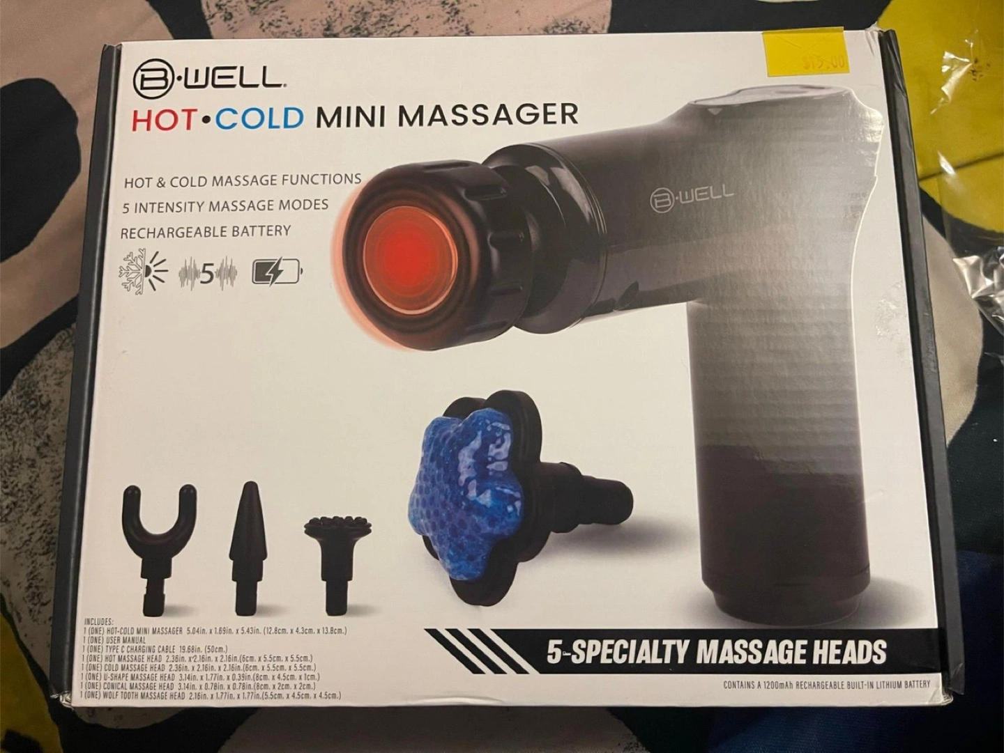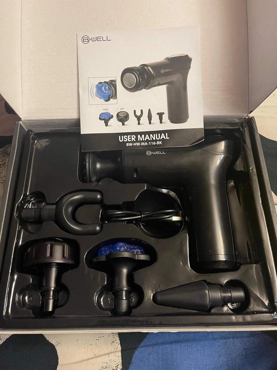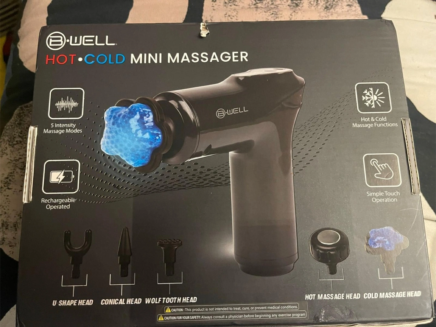 The package includes various massage heads. It has a rechargeable battery. Perfect for a relaxing night in. B-well Hot Cold Mini Massager Gun. Bwell hot cold mini massager hot and cold massager functions five intensity massage modes rechargeable battery five specialty massage heads