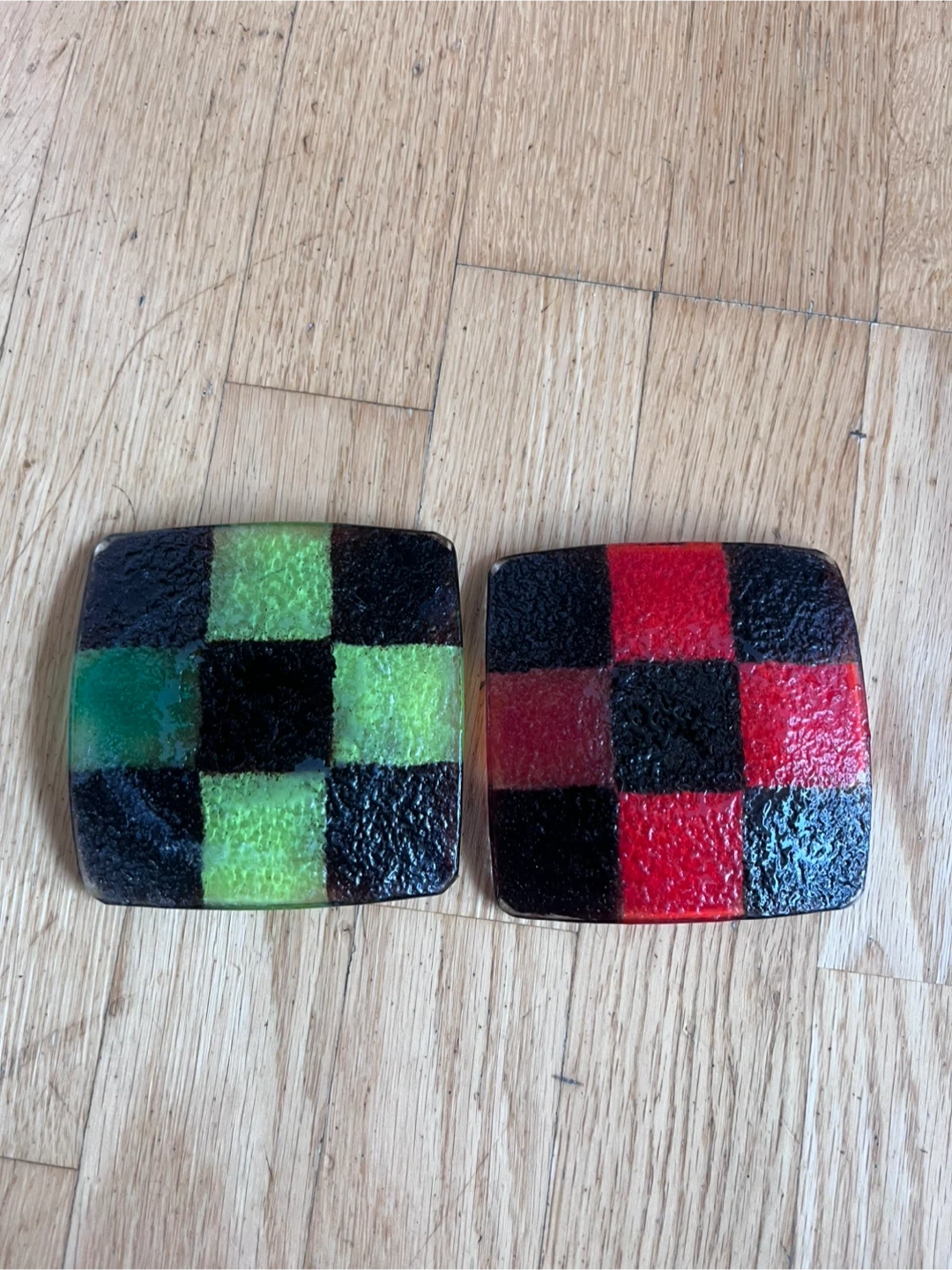 Selling two glass Dom candle holders. One is a green and black checkered pattern, and the other is a red and black checkered pattern.