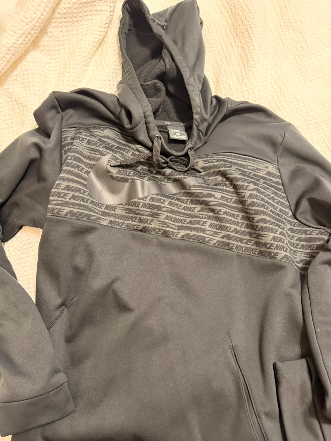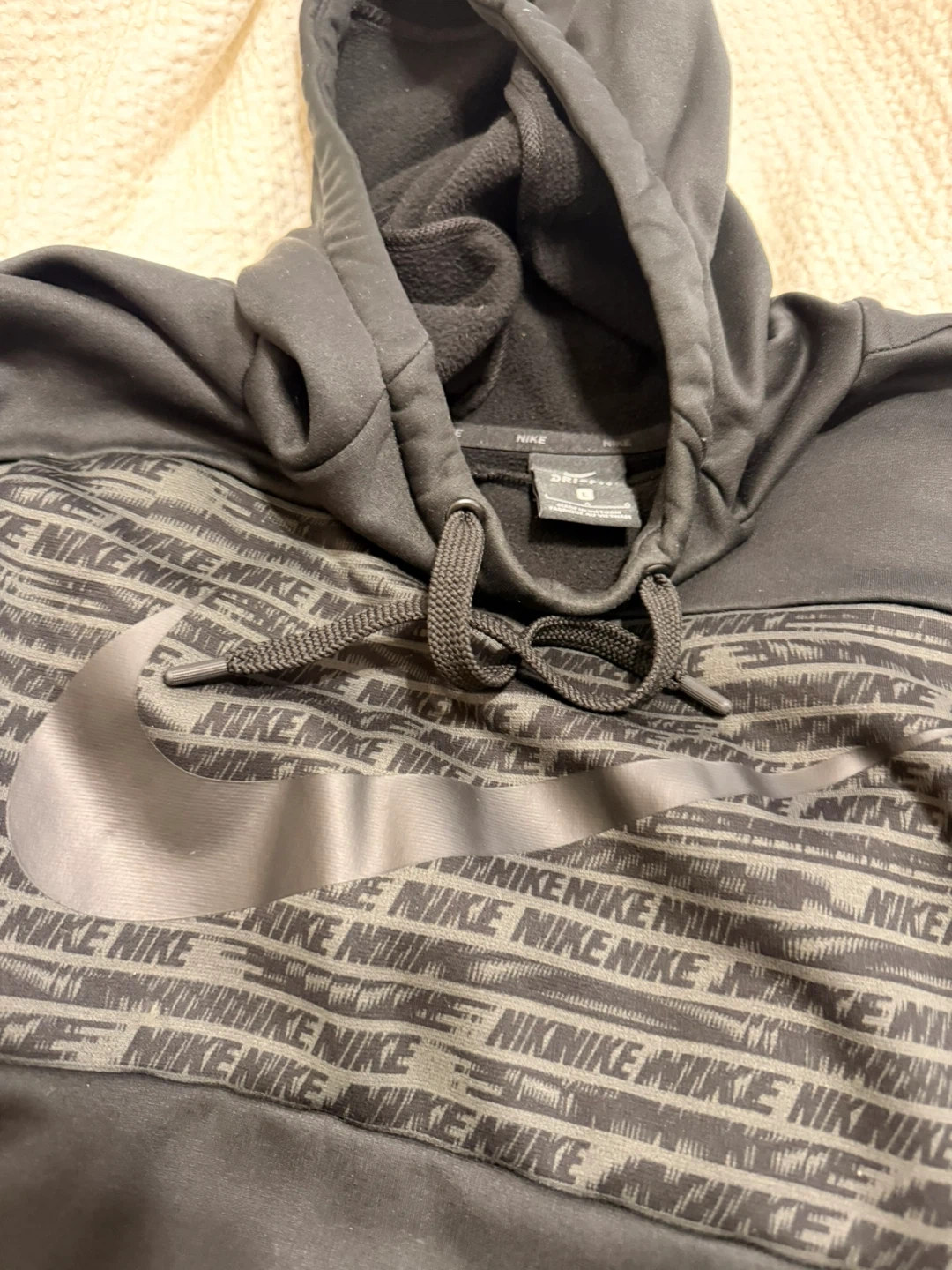 Black Nike Dri-Fit hoodie with a large graphic Nike logo and repeat Nike pattern. Size men’s large.