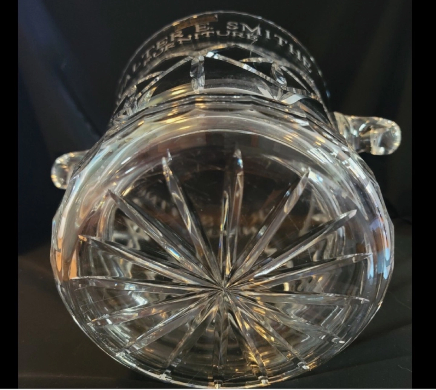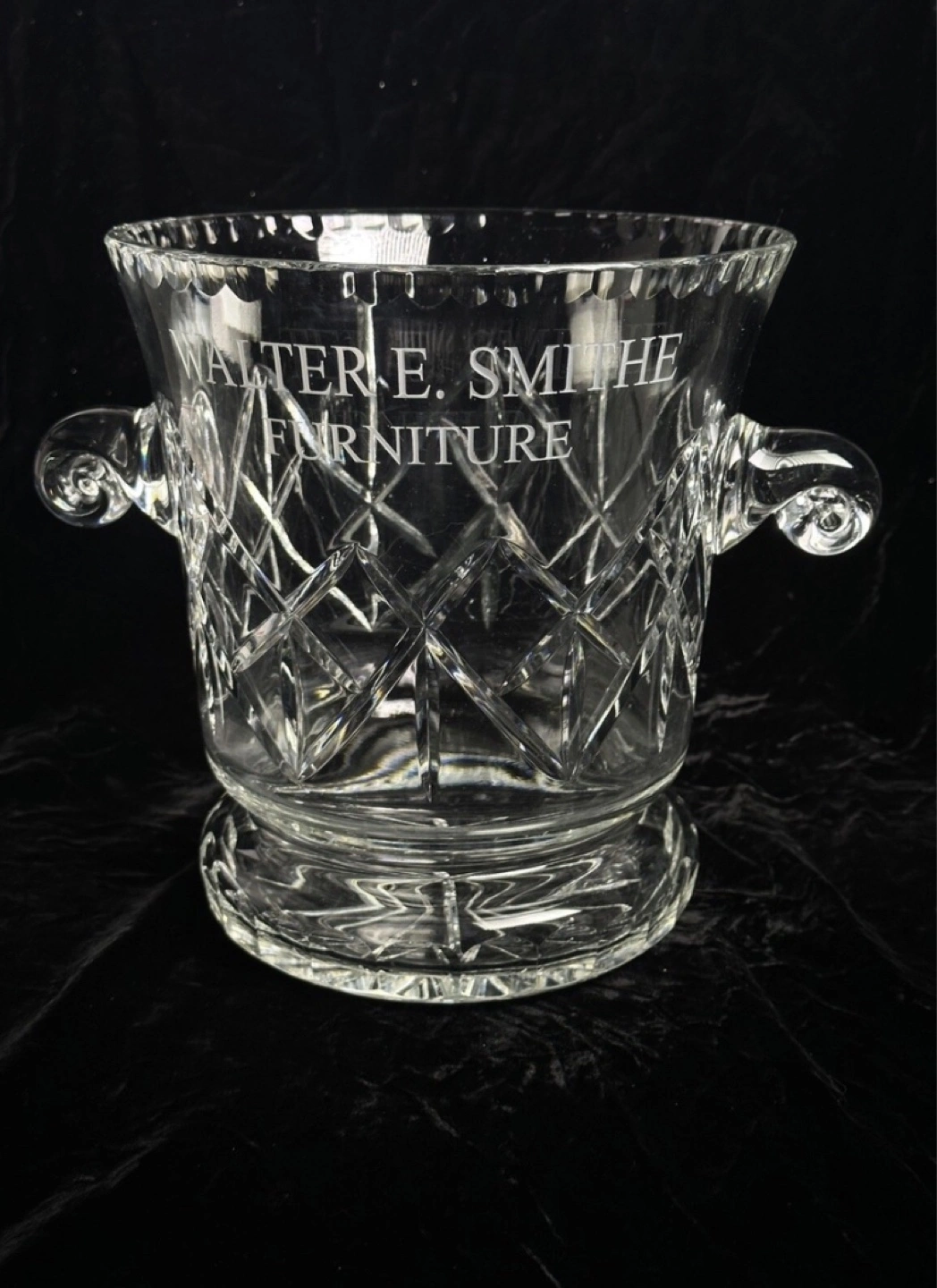 Beautiful crystal ice champagne bucket. Features an engraved inscription: Walter E. Smith Furniture. Elegant design, two handles. I believe it is Tiffany & Co. circa 1980 Adds a touch of class to any occasion.