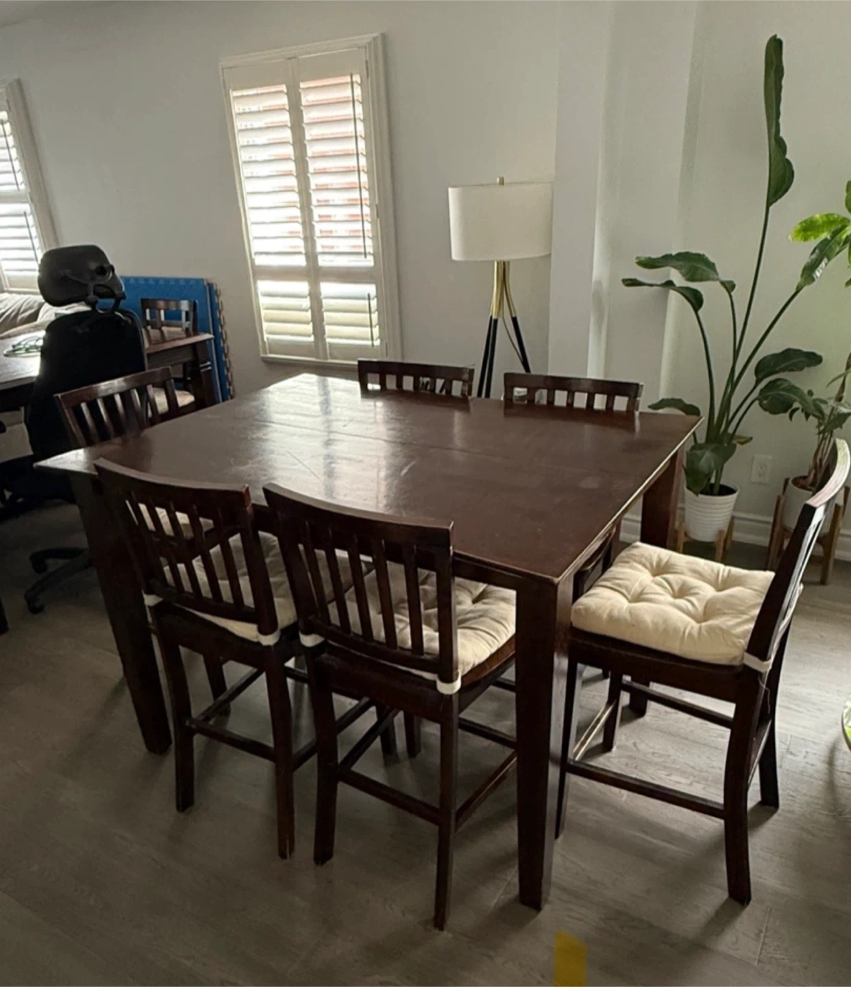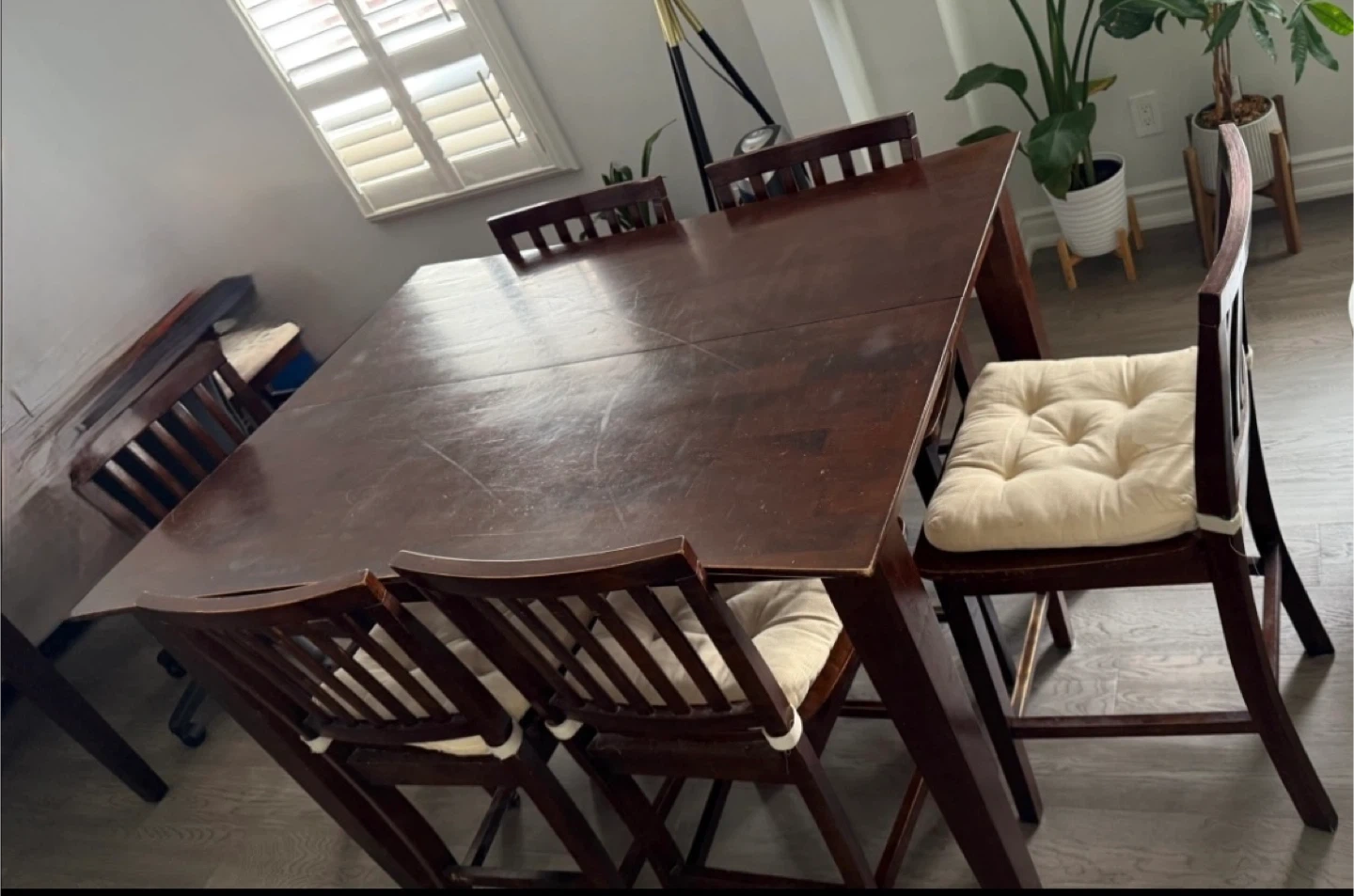 Selling a dining table set that includes the table and six chairs. The table can be extended longer. The set is in good condition and would be great for a family or anyone who enjoys hosting dinners. The chairs have padded cushions for extra comfort. It's a lovely set!