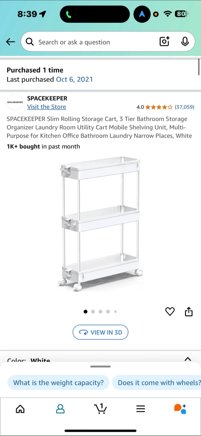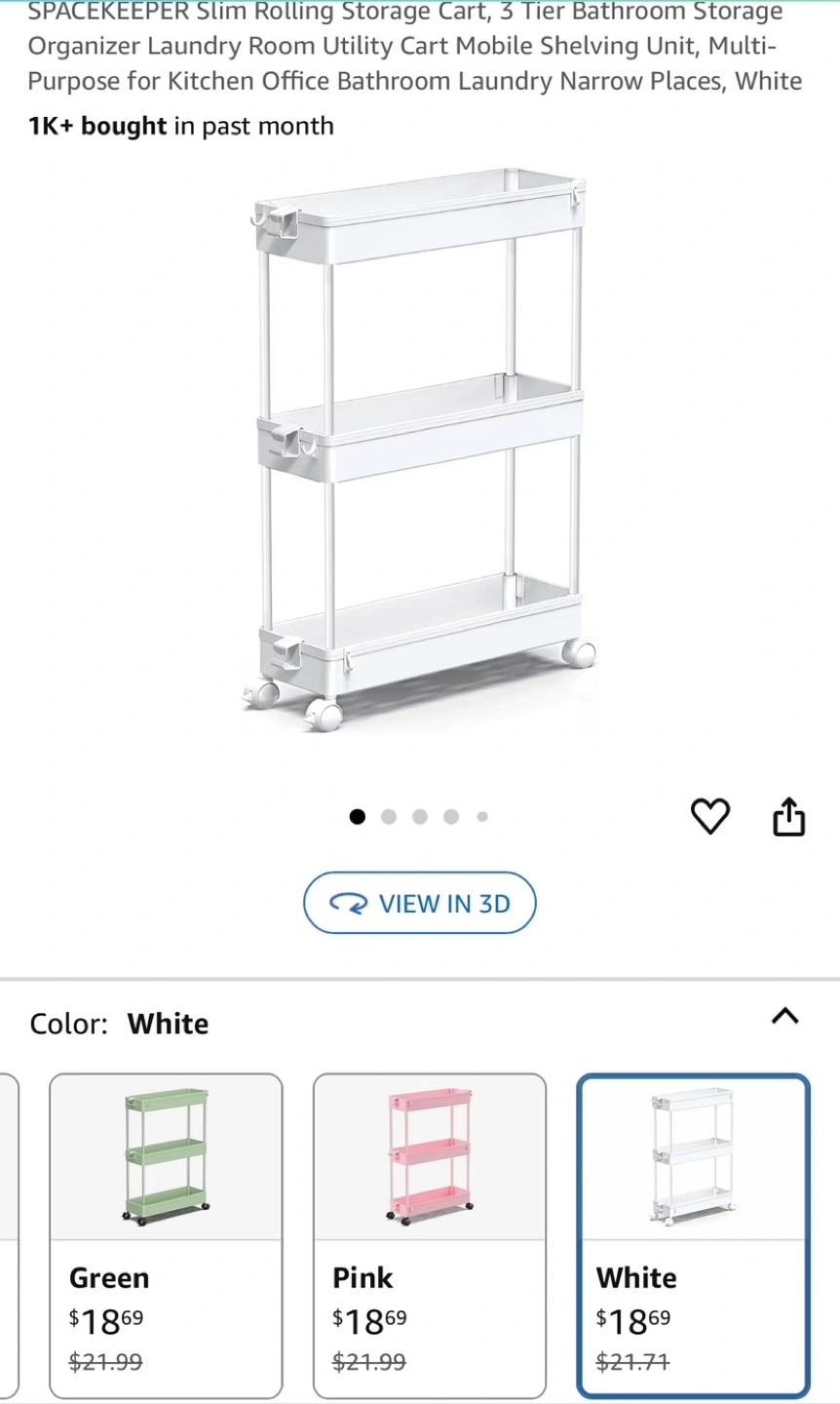 White shelving unit. Features three tiers, perfect for organizing. Rolling design with brakes. Consider using this shelving unit to create a more organized space for you.