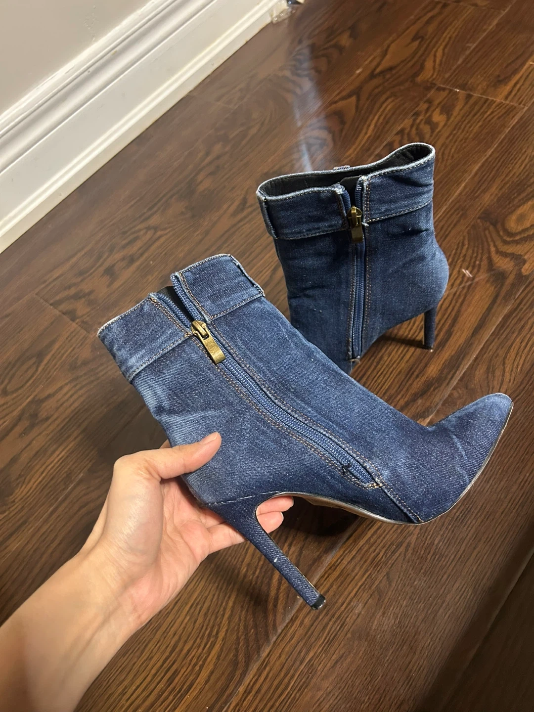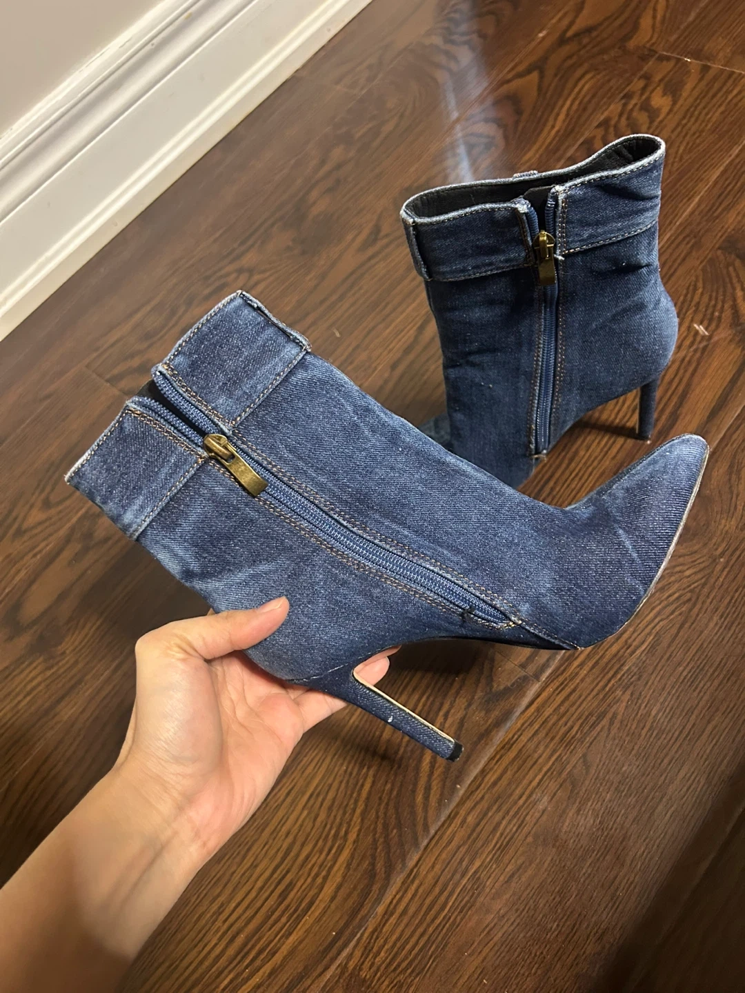 These stylish denim ankle boots feature a pointed toe and a high stiletto heel. They have a side zipper for easy wear. Made from classic blue denim material. Great for adding a bit of edge to any outfit!