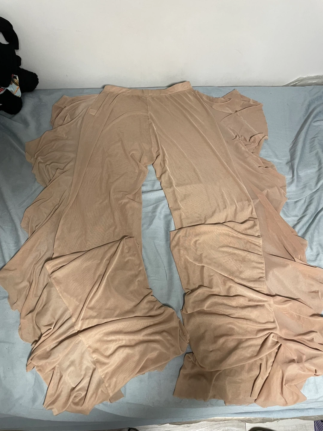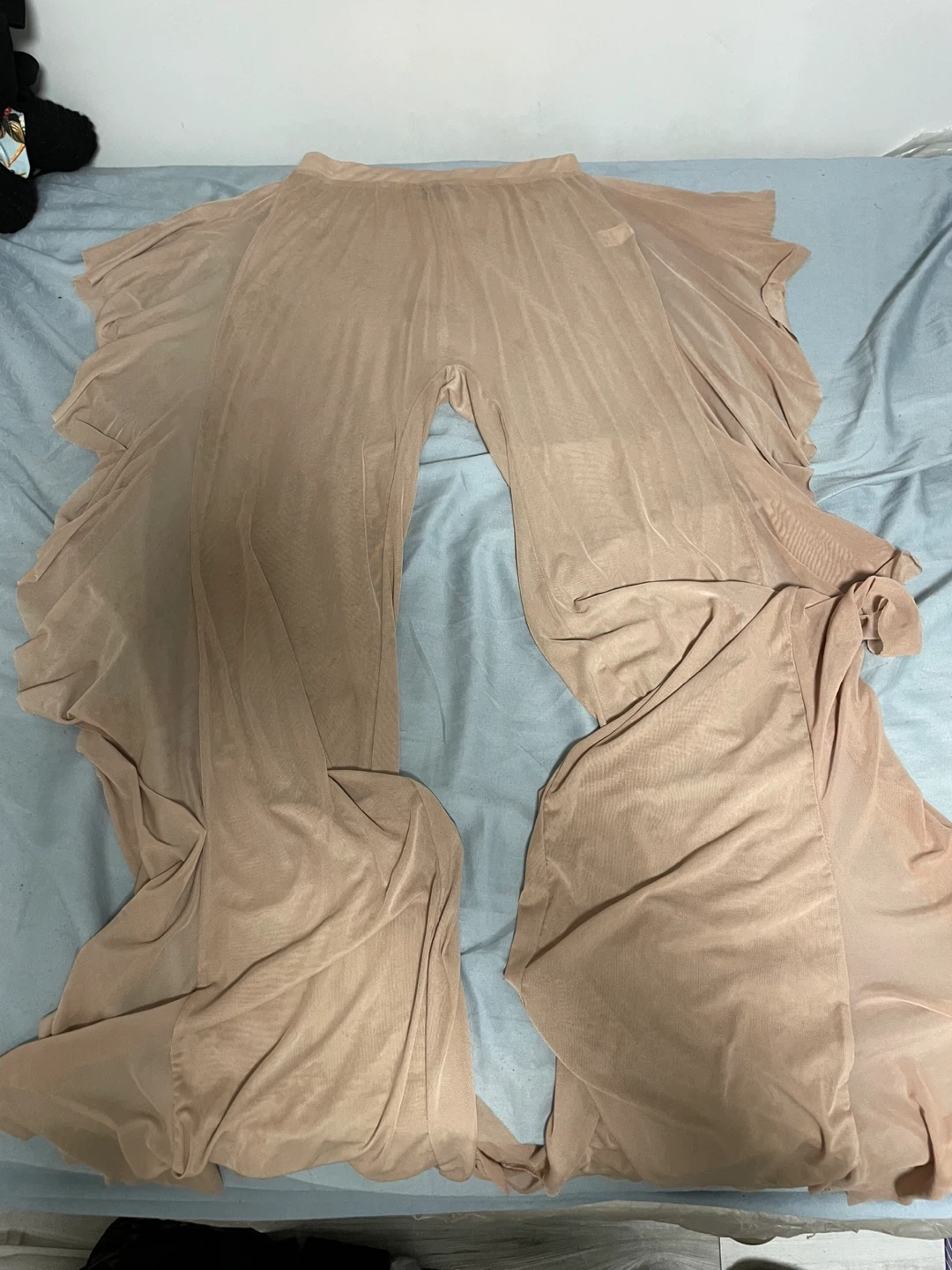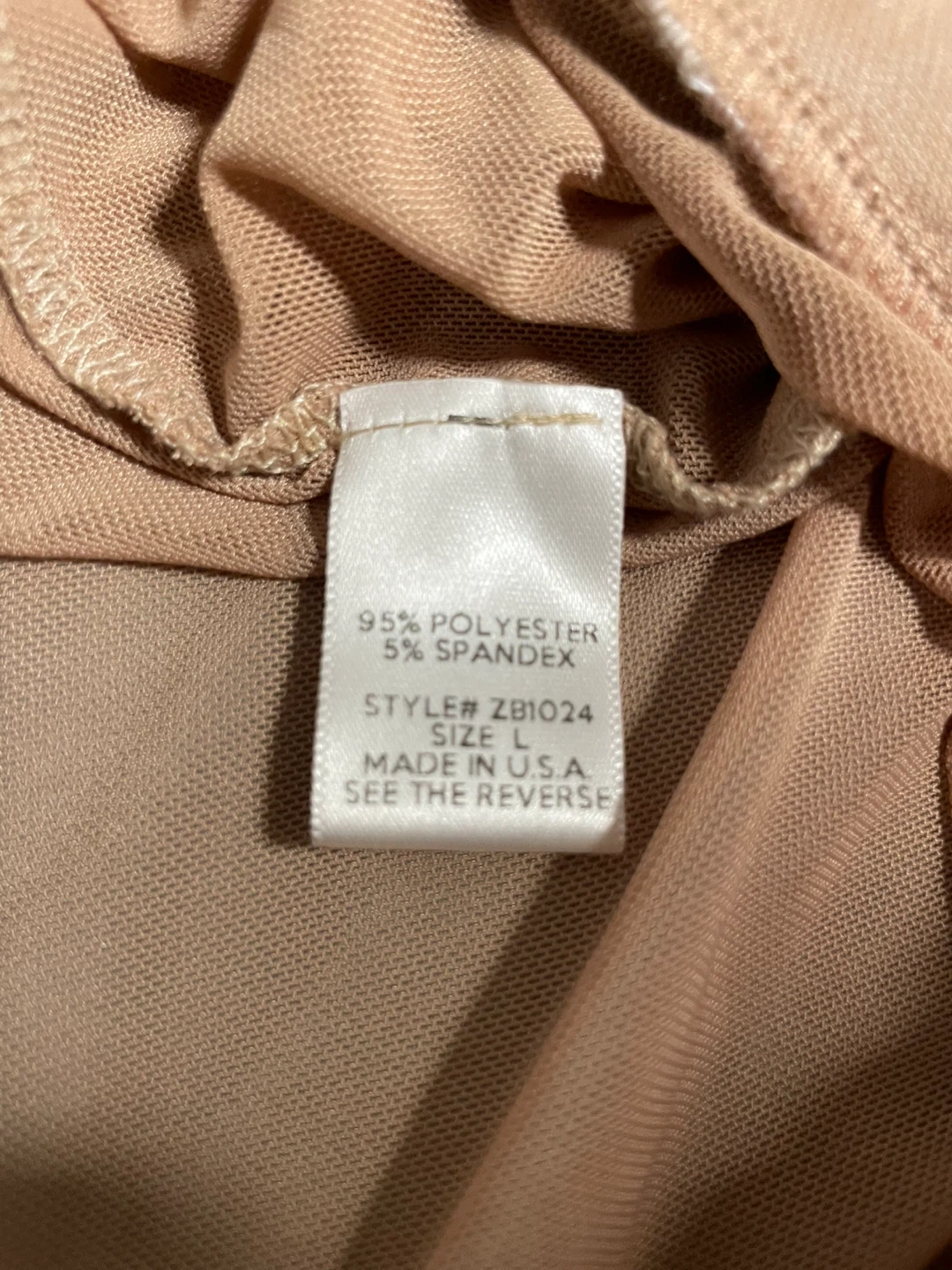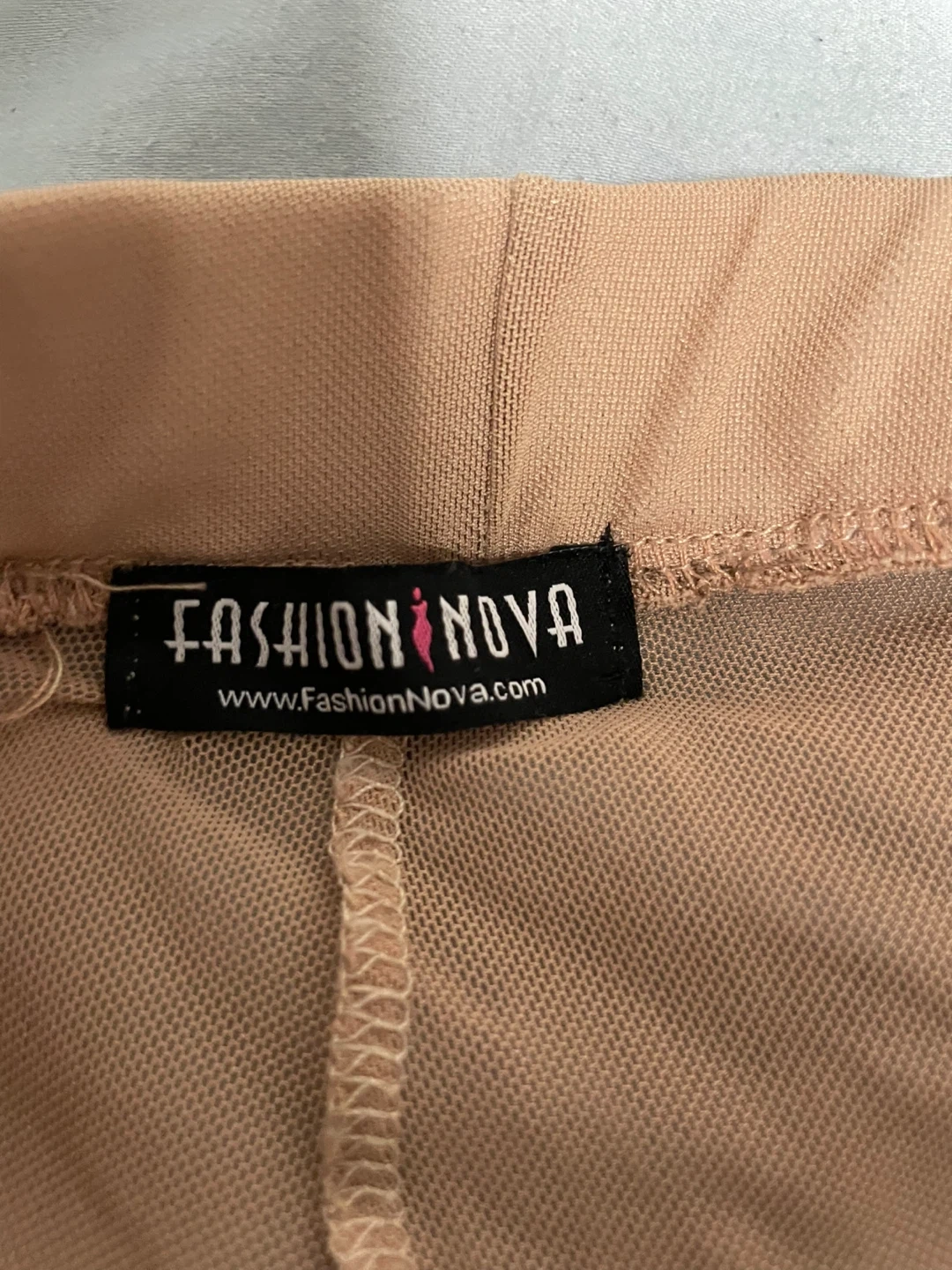 Selling a pair of Fashion Nova beige pants in size L. They're made of 95% polyester and 5% spandex.
