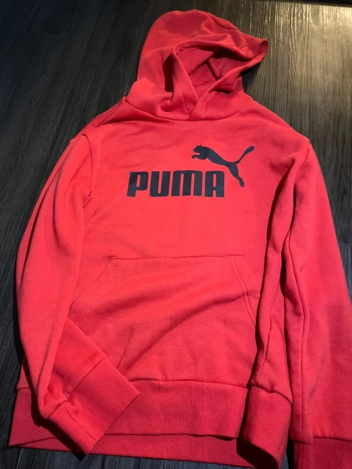 This is a bright red Puma hoodie. It features the classic Puma logo in black on the chest and has a front pocket.