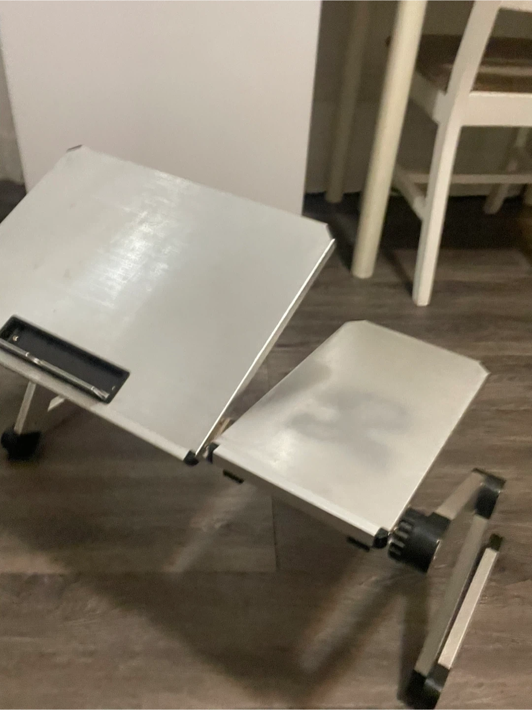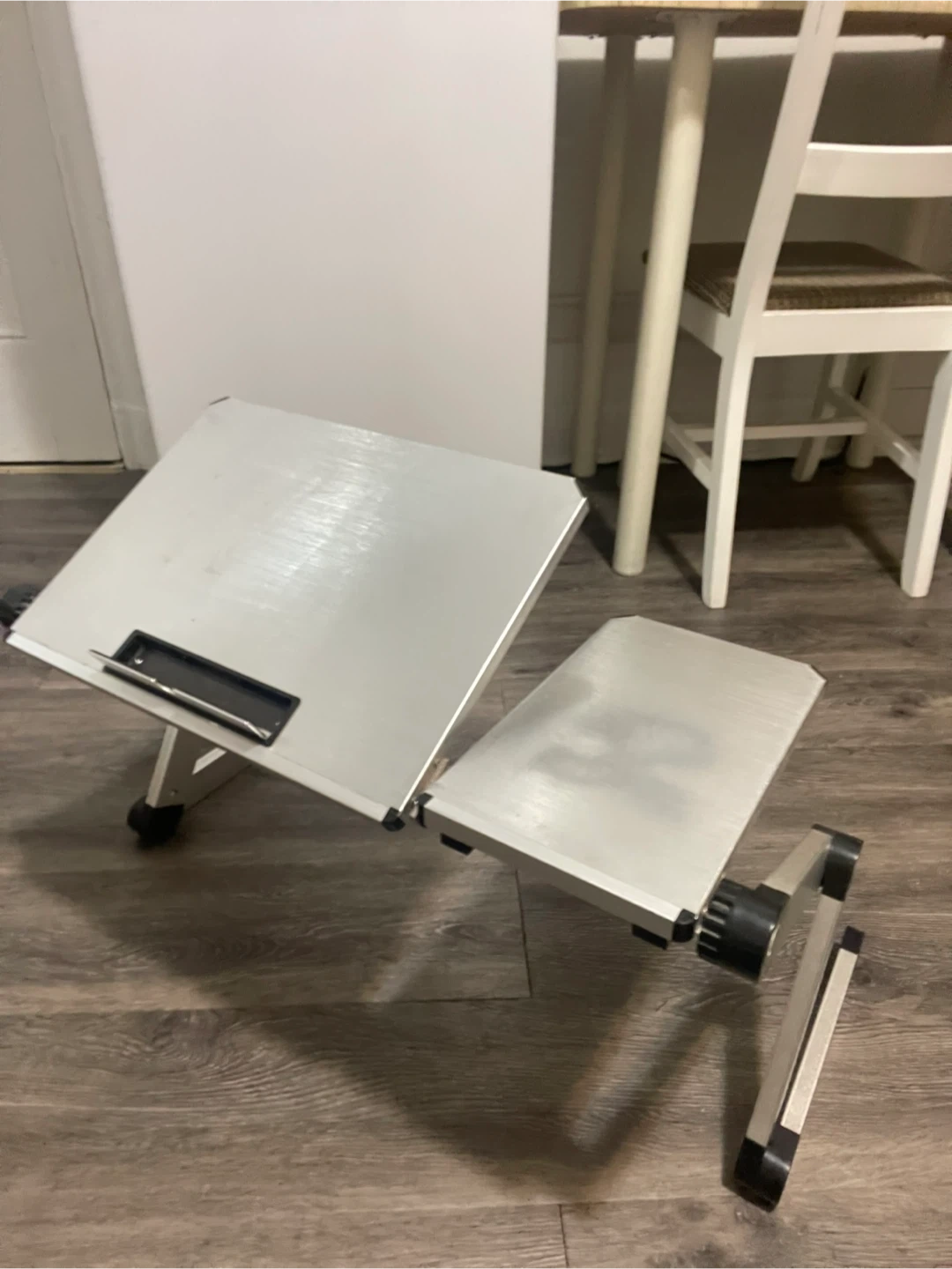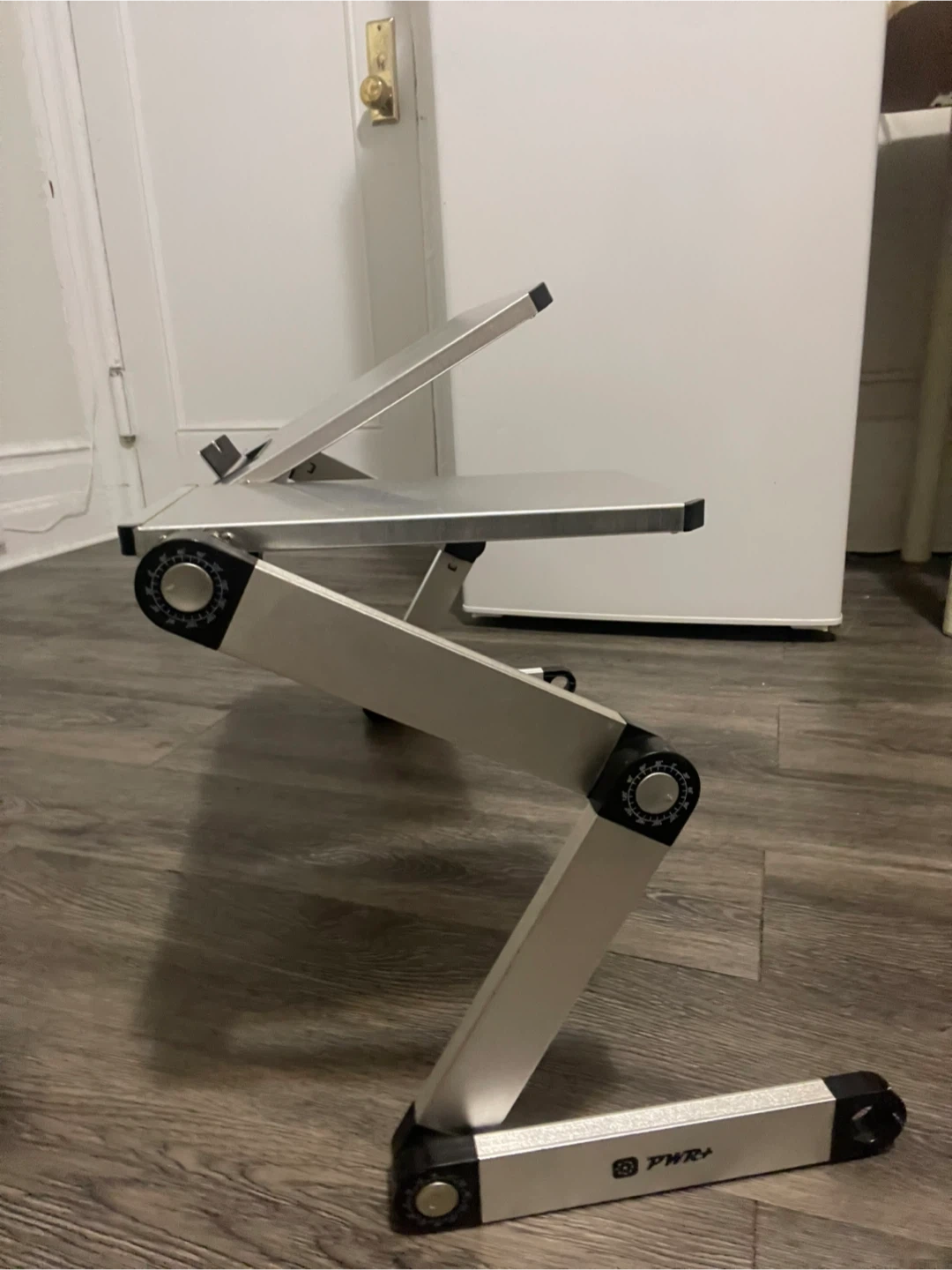This portable laptop stand features an adjustable design for comfortable use. Its aluminum construction offers durability. It's ideal for setting up your laptop on various surfaces.