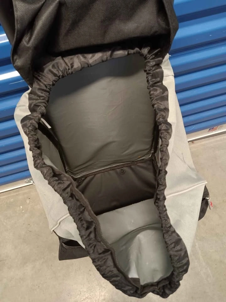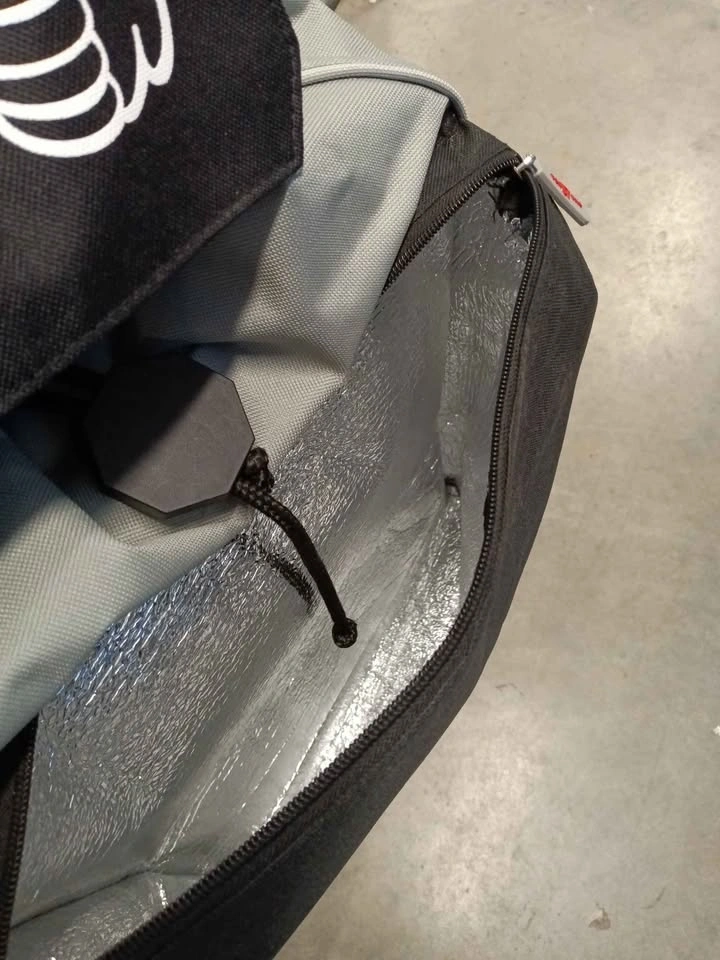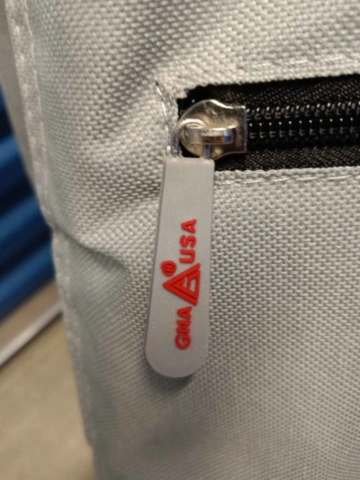 Durable grey and black rolling cart with large main compartment and drawstring closure. Front features insulated zippered pocket for cold items. Black ergonomic handle is sturdy for easy transport. GNA USA logo is on front flap.