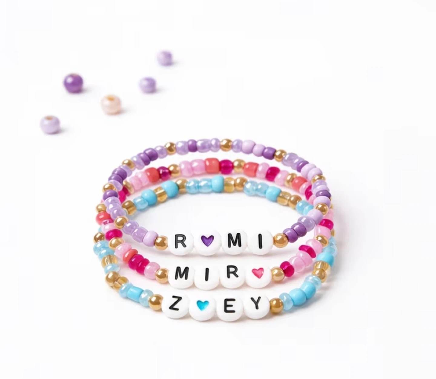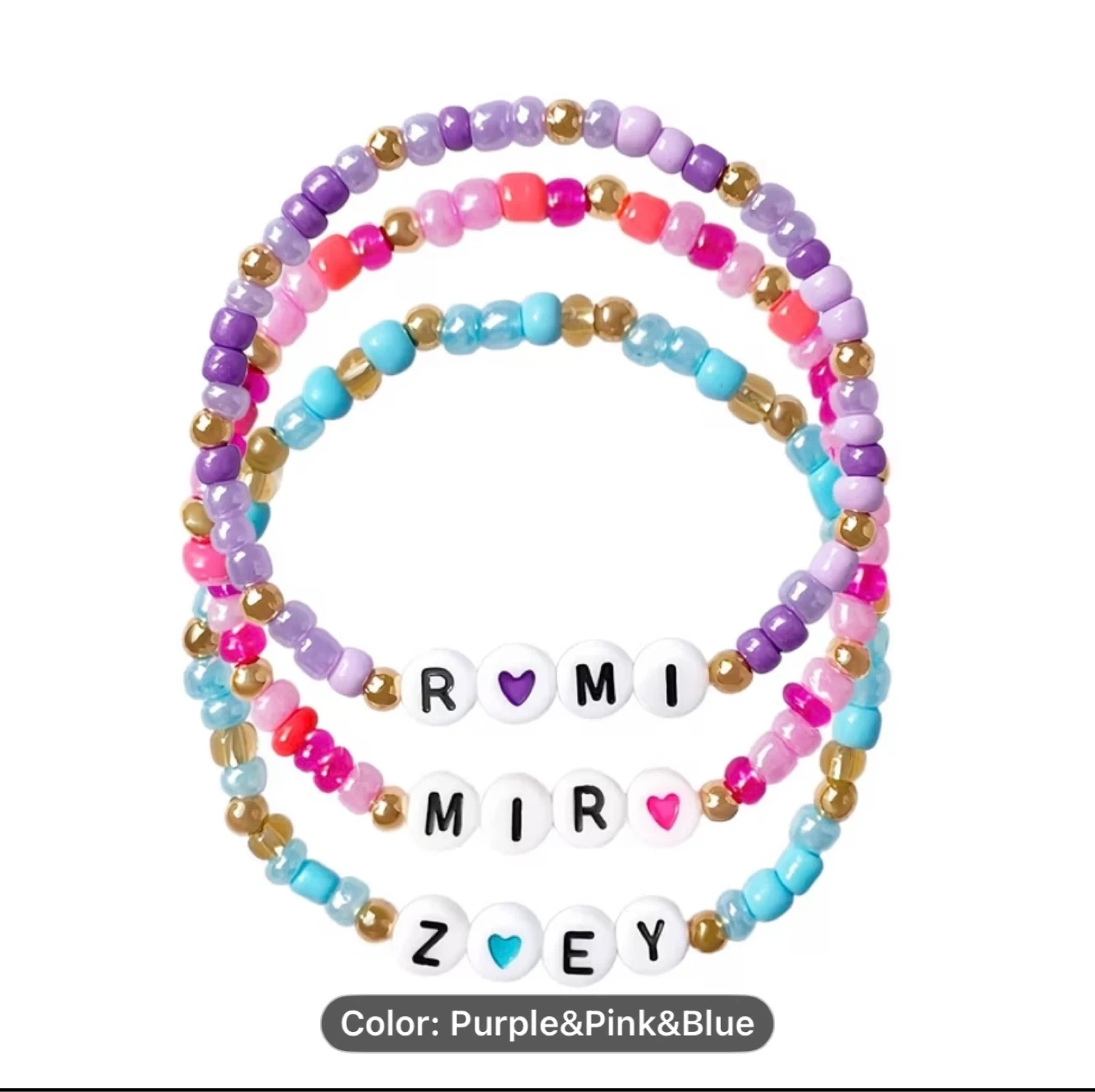 Set of three stretchy beaded bracelets. Each bracelet is made with colorful beads and personalized letter beads spelling out names. Colors include purple, pink, and blue with gold accents. These bracelets are perfect for kids or as a fun accessory!