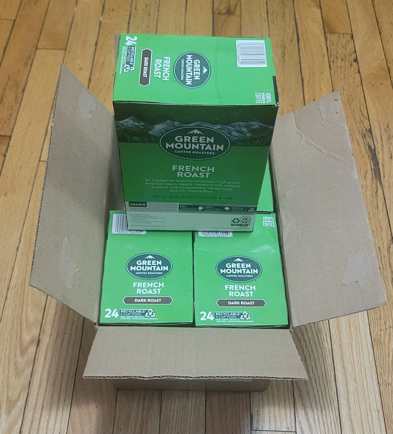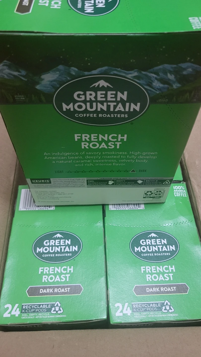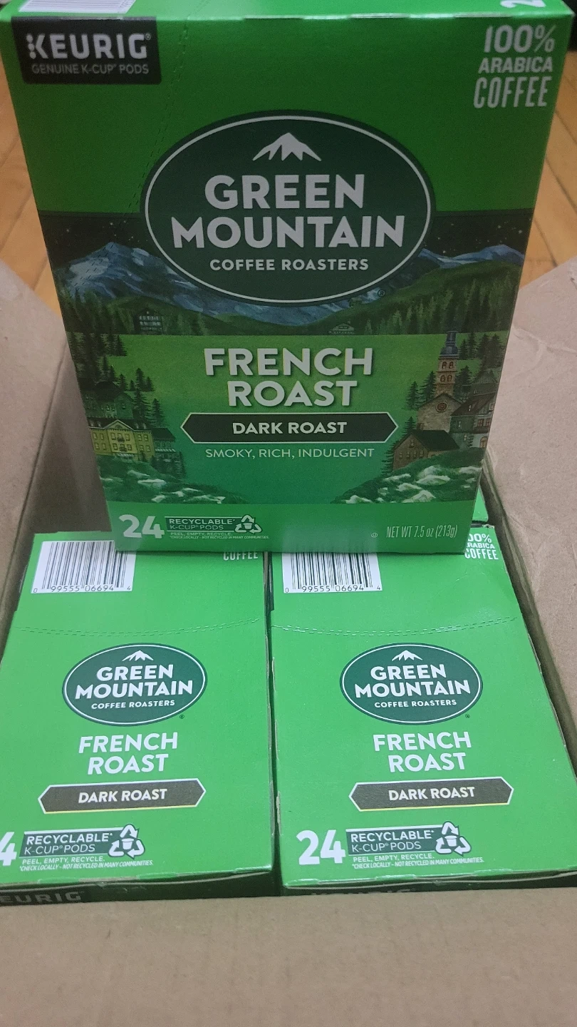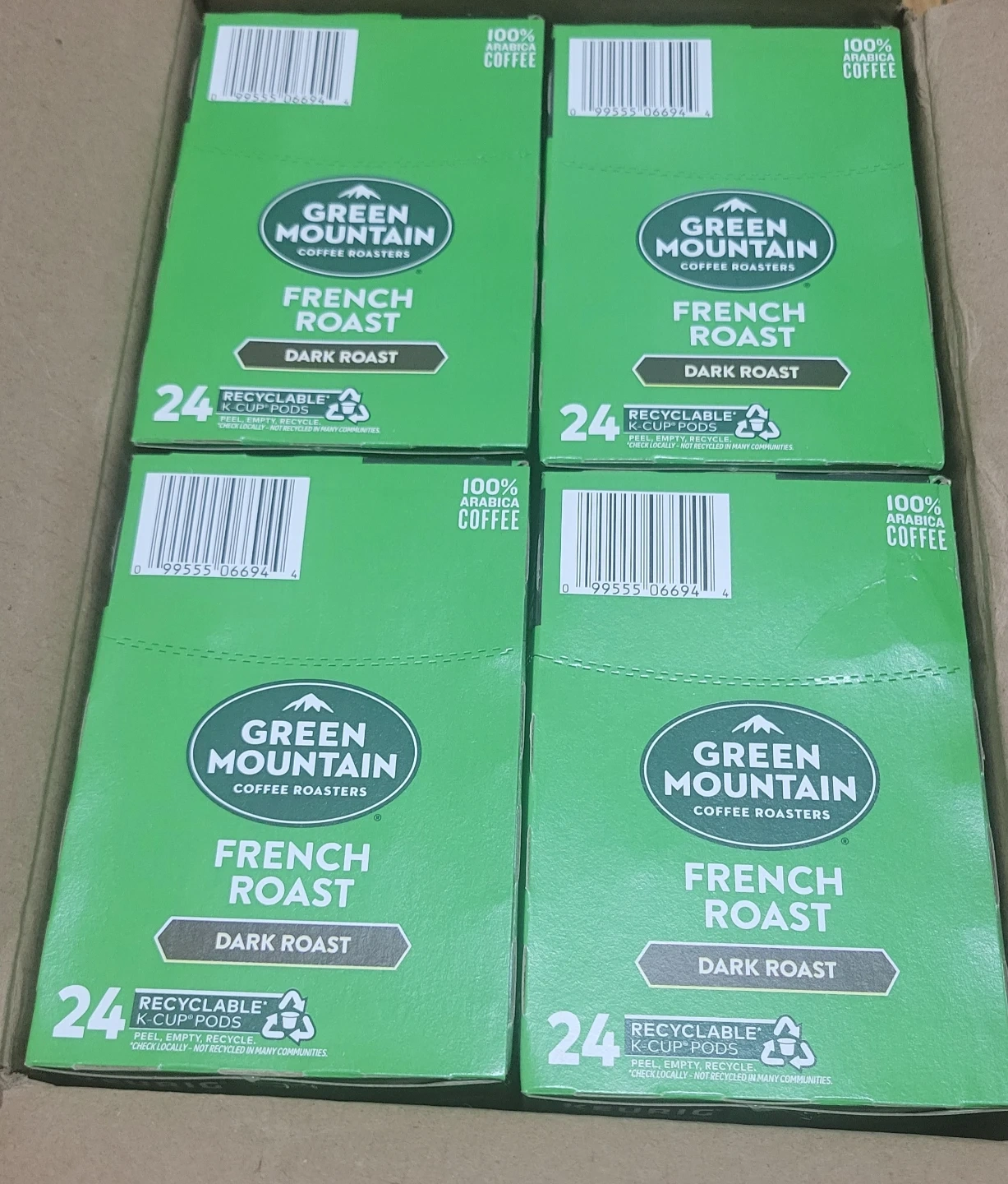Get your morning started right with Green Mountain Coffee Roasters French Roast Dark Roast K-Cup Pods. This is a 4-box case, with each box containing 24 recyclable K-Cup pods, for a total of 96 pods. The coffee is 100% Arabica. Best by 07 SEP 2026.