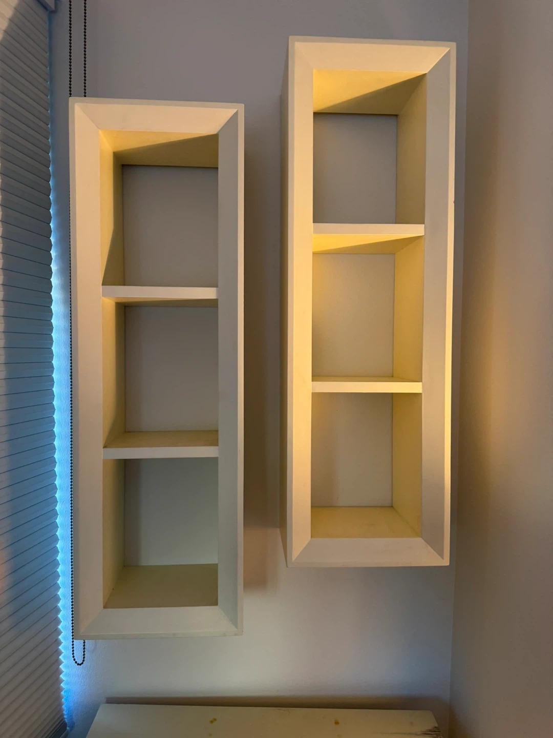 Two Pottery Barn cream-colored floating shelves with a modern, geometric design. Each shelf has two open cubbies for display. These are great for adding decorative storage to any room!
