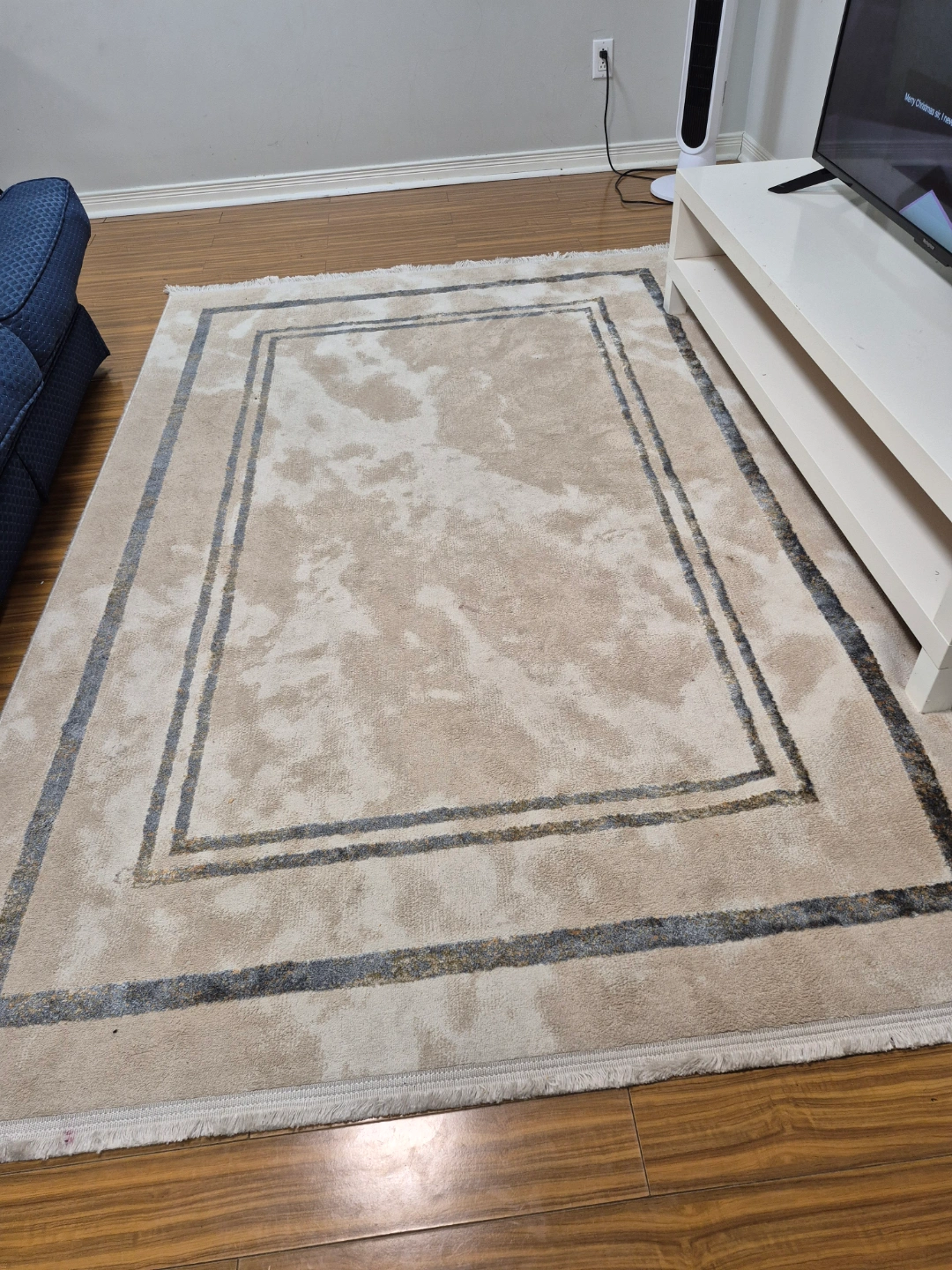 Large beige rug. Features a grey and beige border. Soft texture. Good condition.