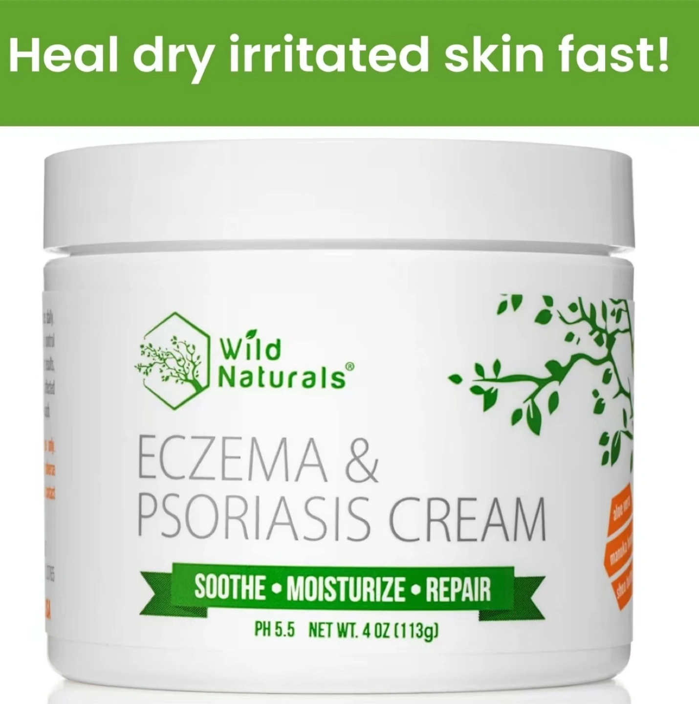 a jar of Wild Naturals Eczema & Psoriasis Cream! It's a soothing cream that helps to moisturize and repair skin. The net weight is 4 oz (113g). Great for healing dry, irritated skin!