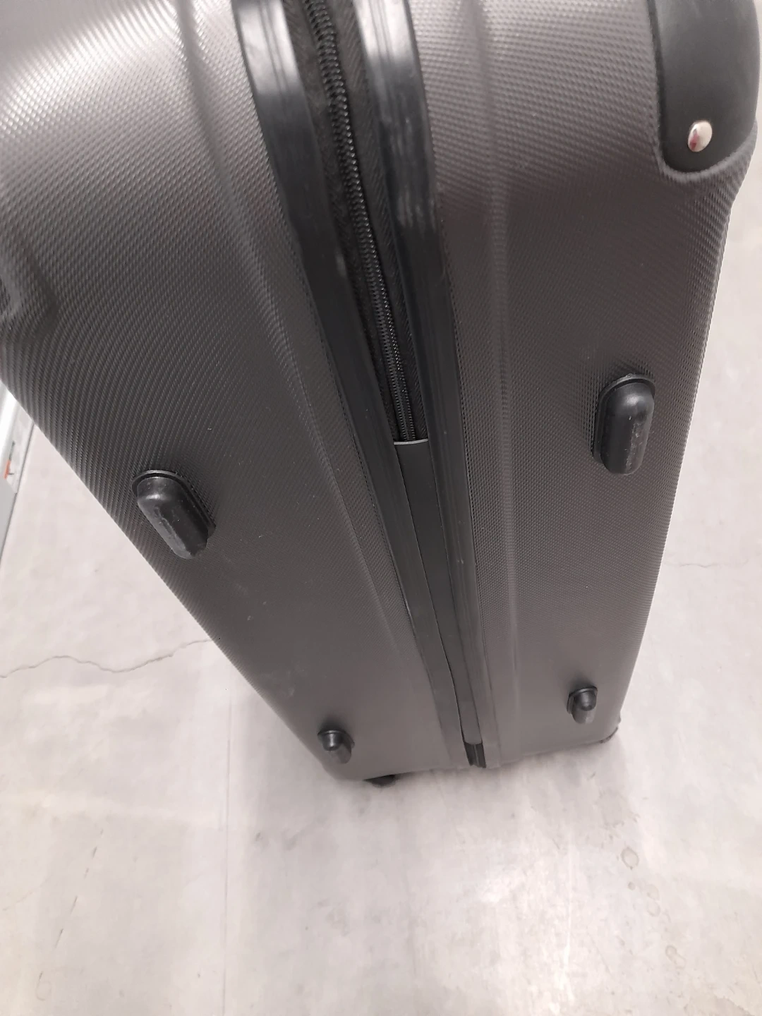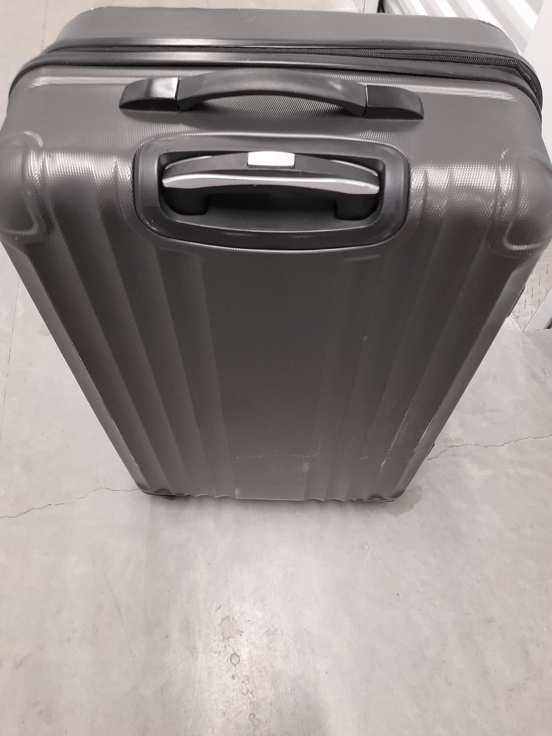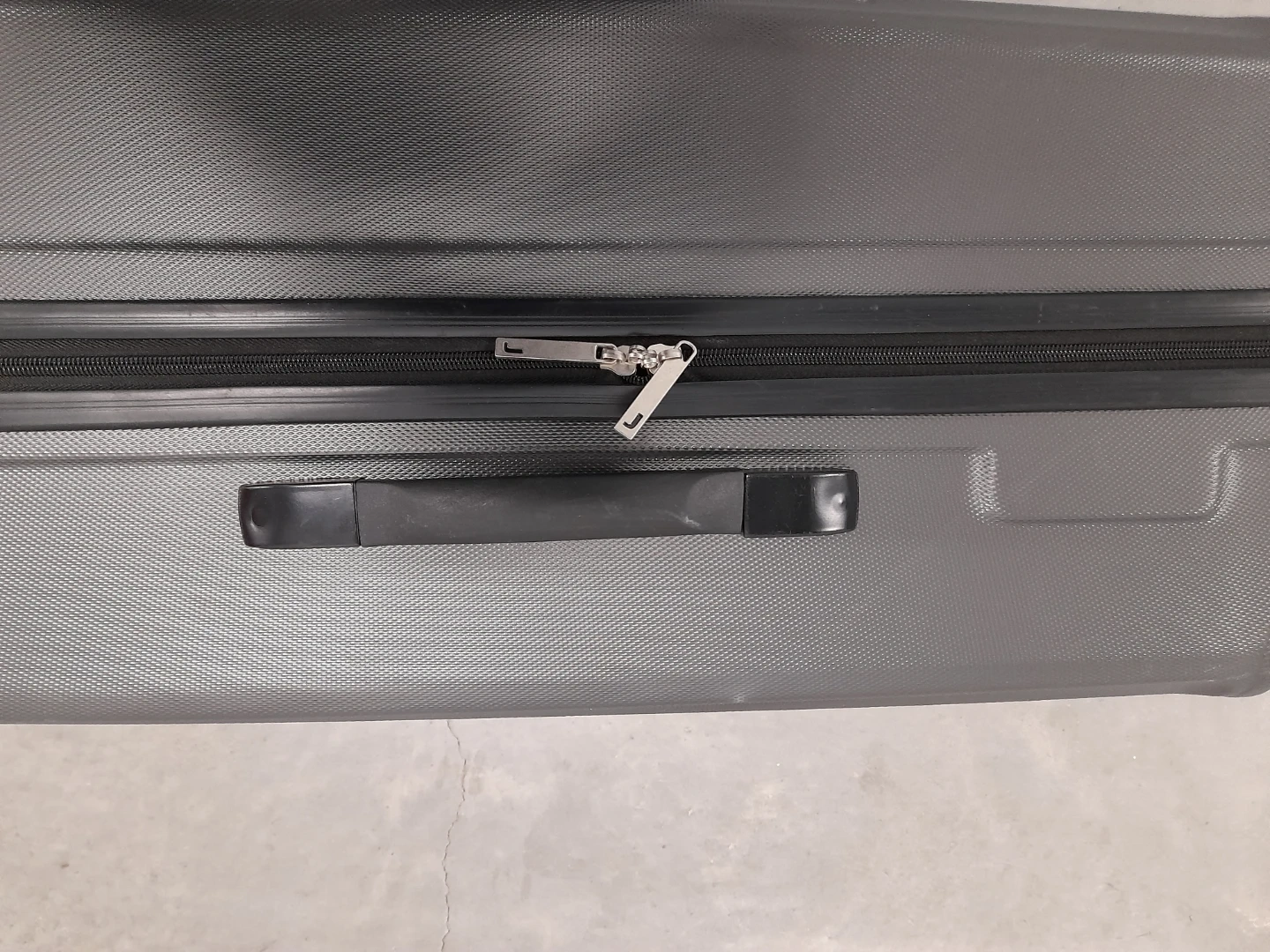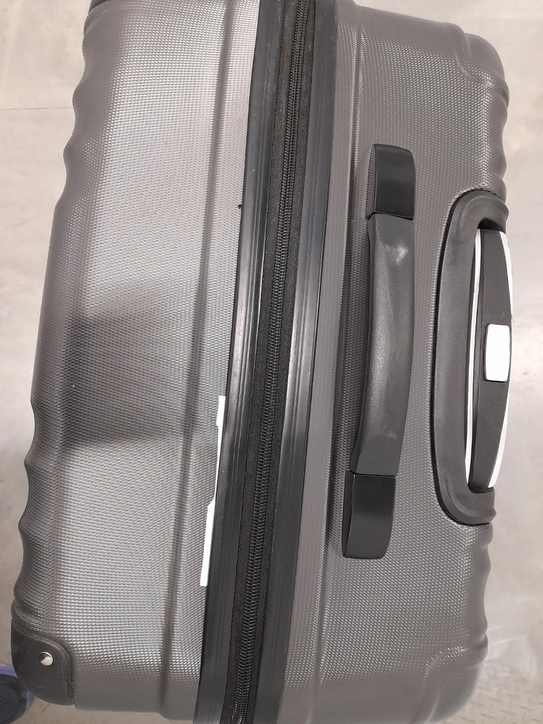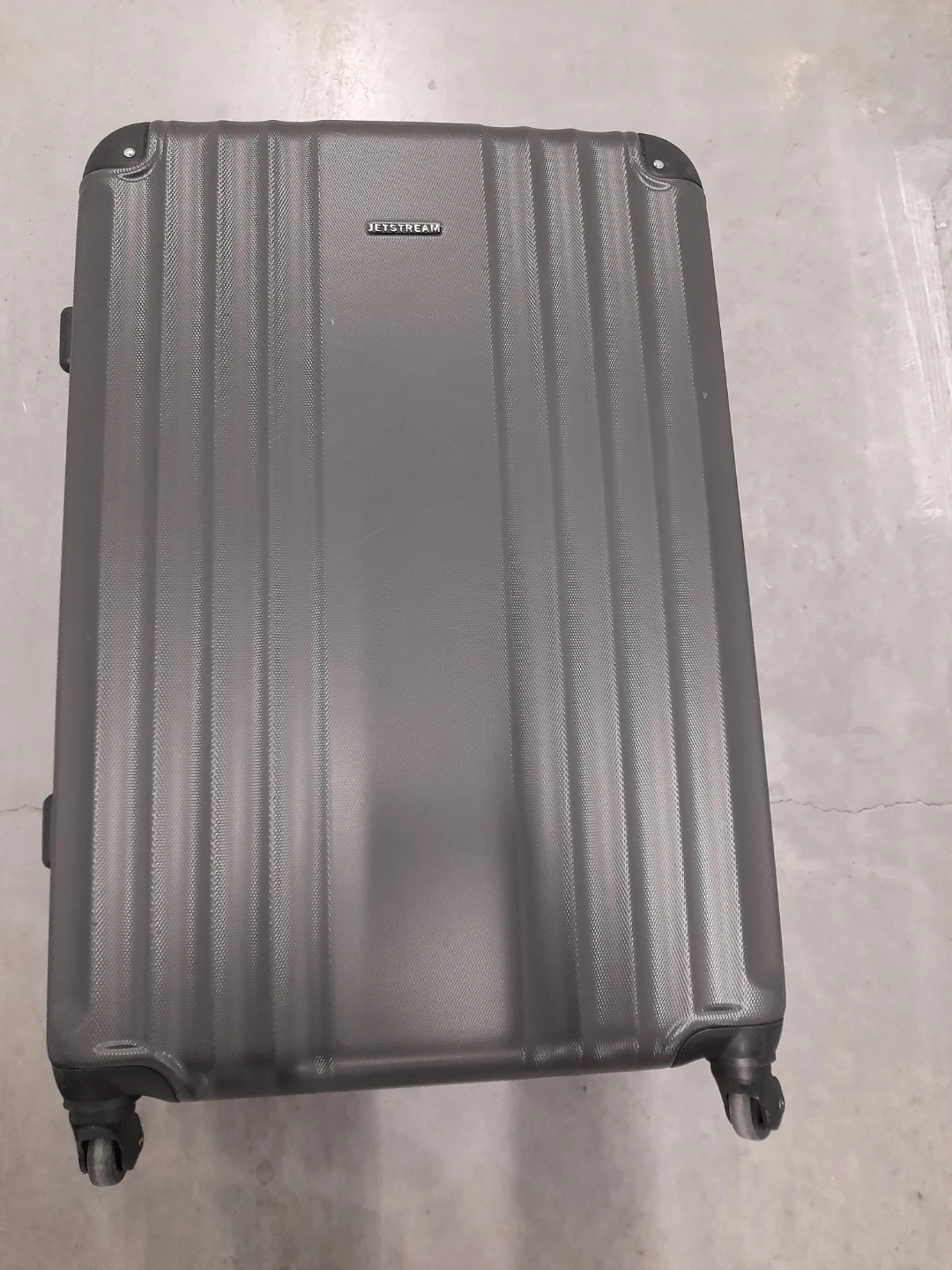 This is a grey hardside spinner suitcase from Jetstream. It features a textured exterior and multiple handles for easy carrying. The interior is spacious for your travel needs.