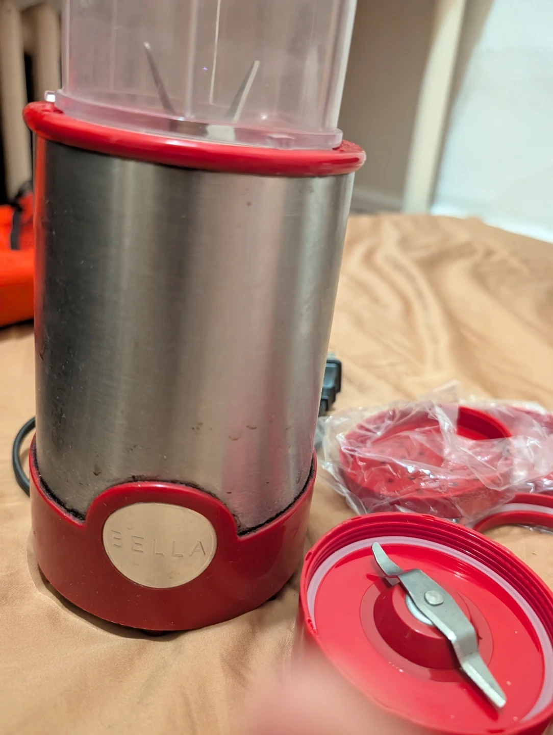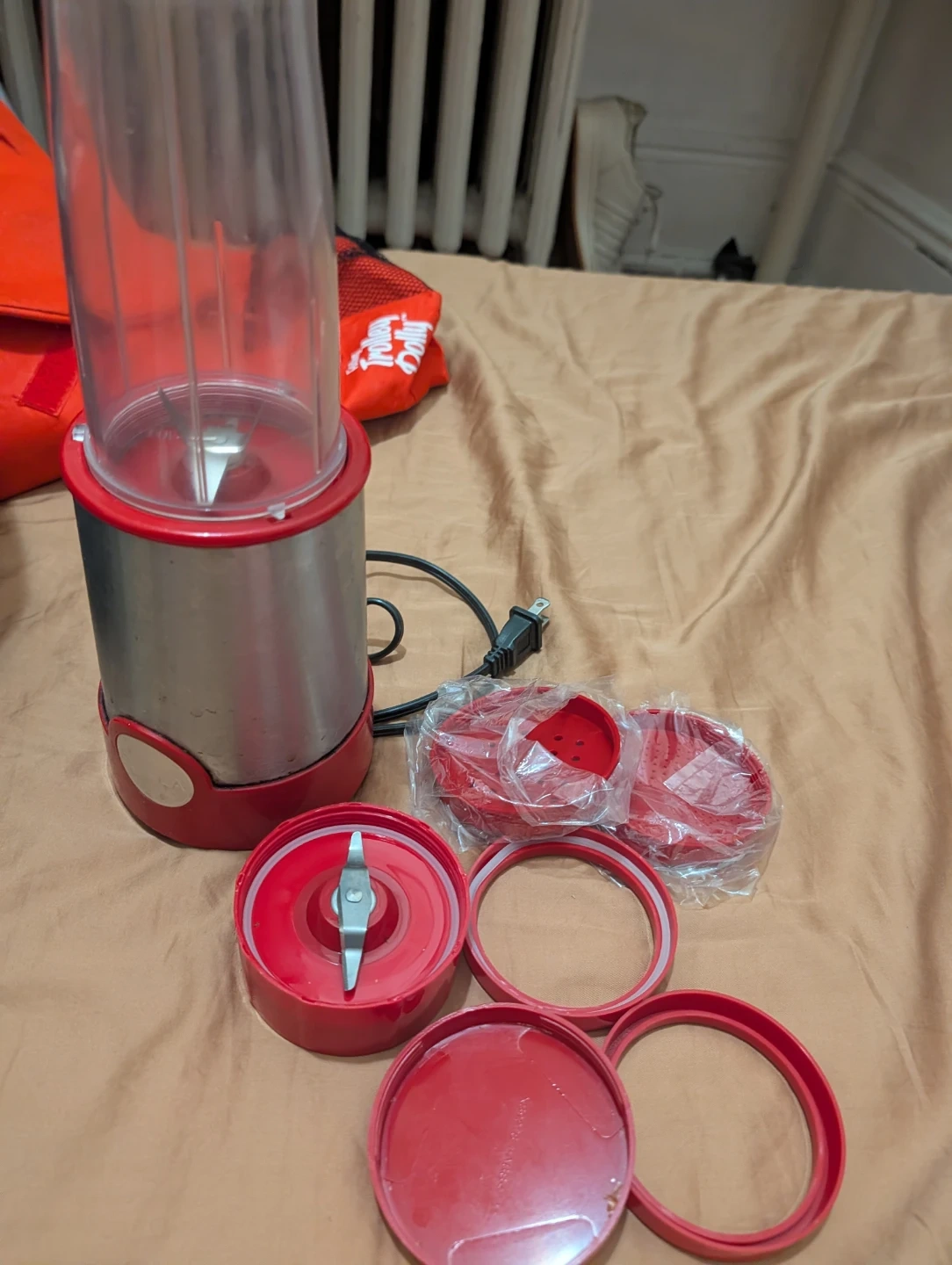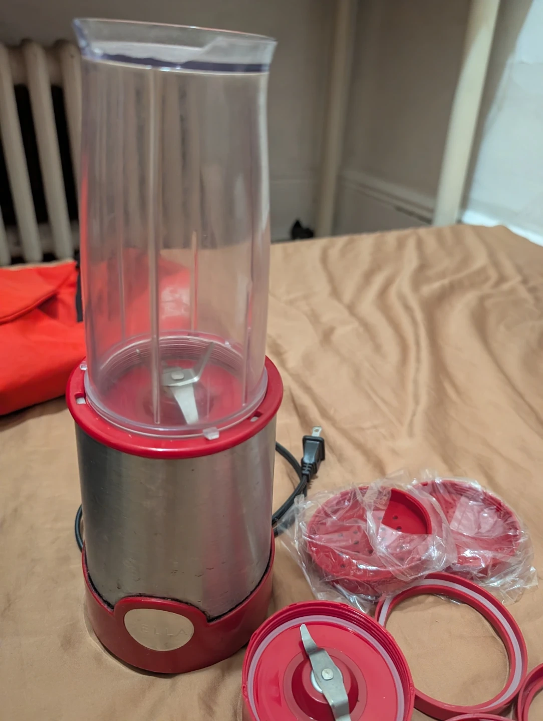 This BELLA Rocket Blender is red and silver. It comes with a power base, blender cup, and multiple lids. Blades are sharp and ready for use.