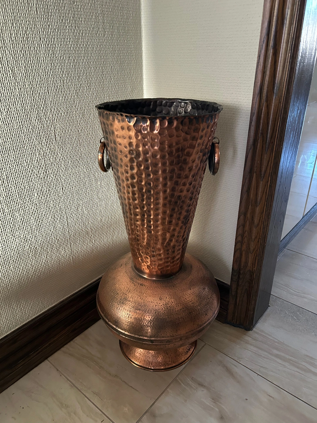 Hammered copper umbrella stand that can also be used as a standing vase.