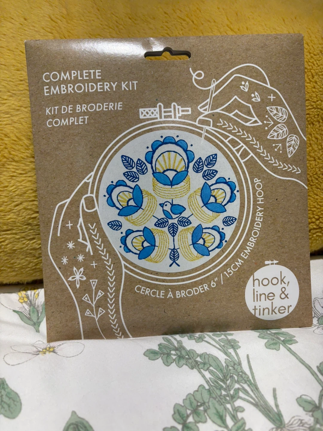Complete embroidery kit for beginners. Includes a 6" embroidery hoop, pre-printed fabric, embroidery floss, needle, and instructions. Brand new, opened but never used