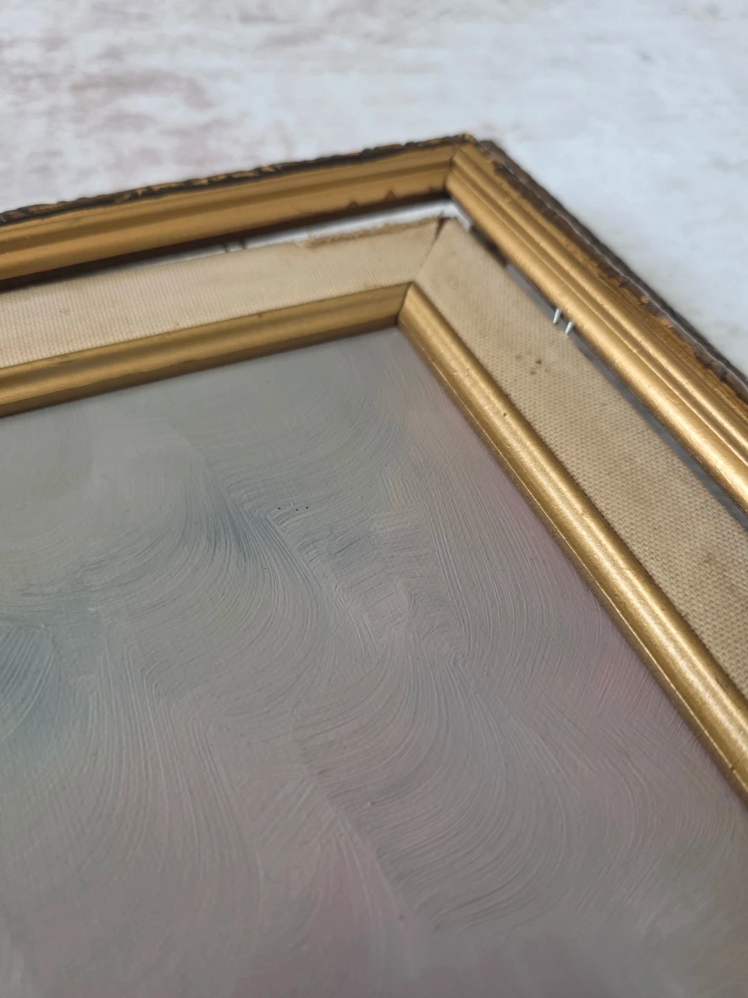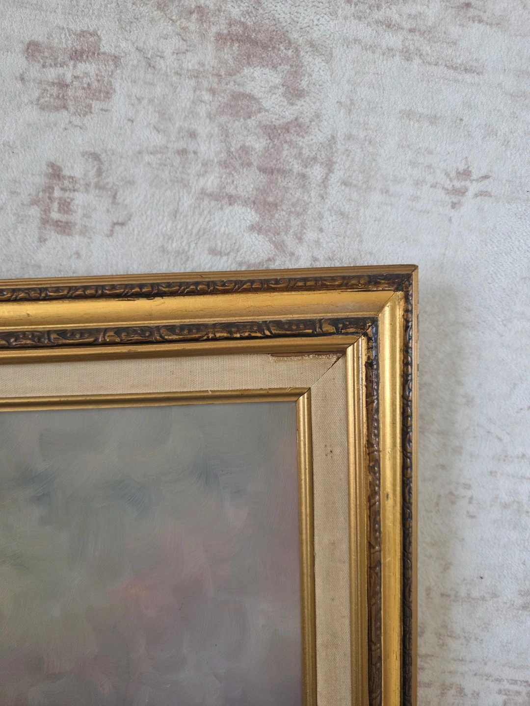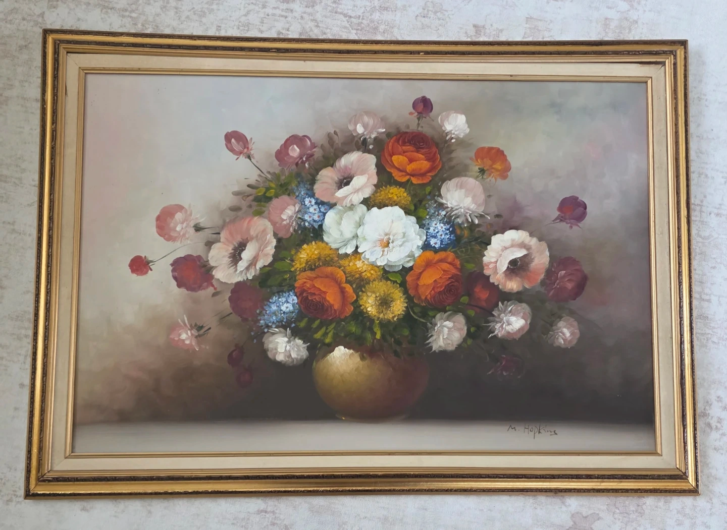 This is a beautiful vintage oil painting of a floral arrangement, signed by artist M. Hopkins. The artwork is housed in an ornate gold frame. Its vibrant colors and detailed brushstrokes add a touch of elegance to any space. 41.5" by 30