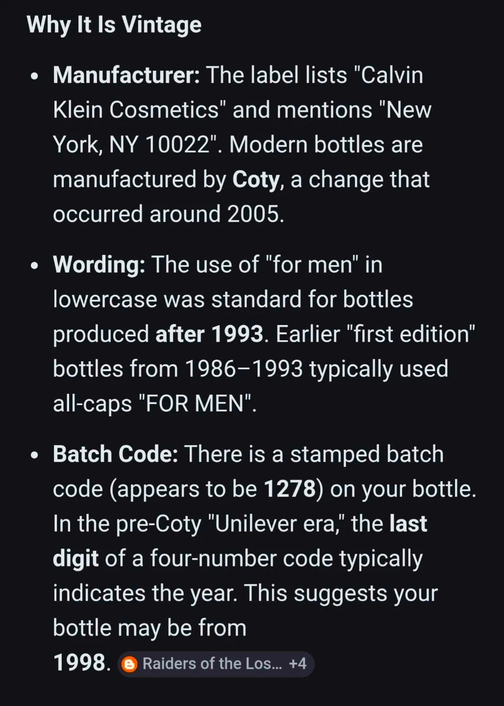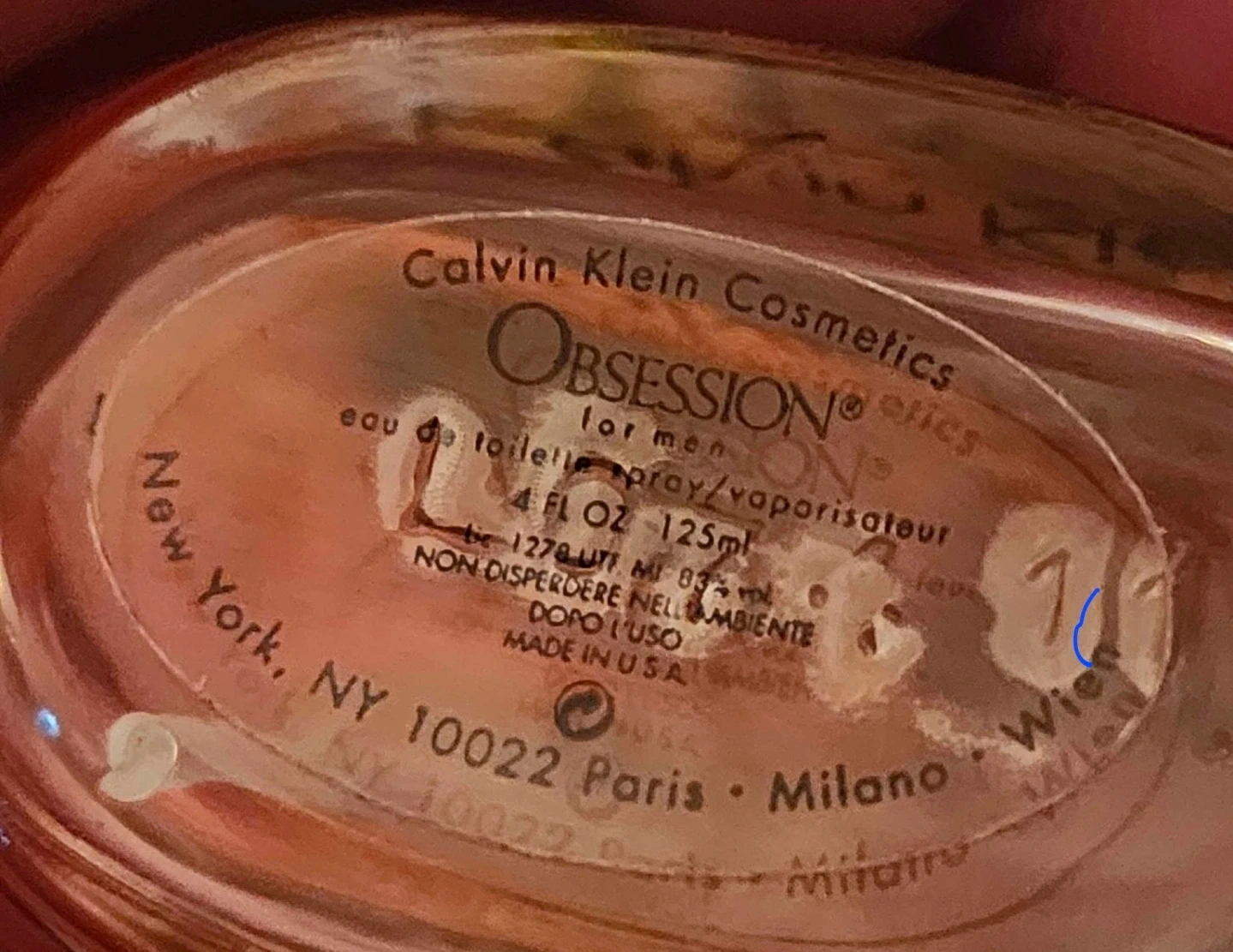 The scent is still strong and masculine. This bottle is a vintage gem for collectors because the original formula is considered richer and more complex than modern versions! The label lists "Calvin Klein Cosmetics" and mentions "New York, NY 10022".