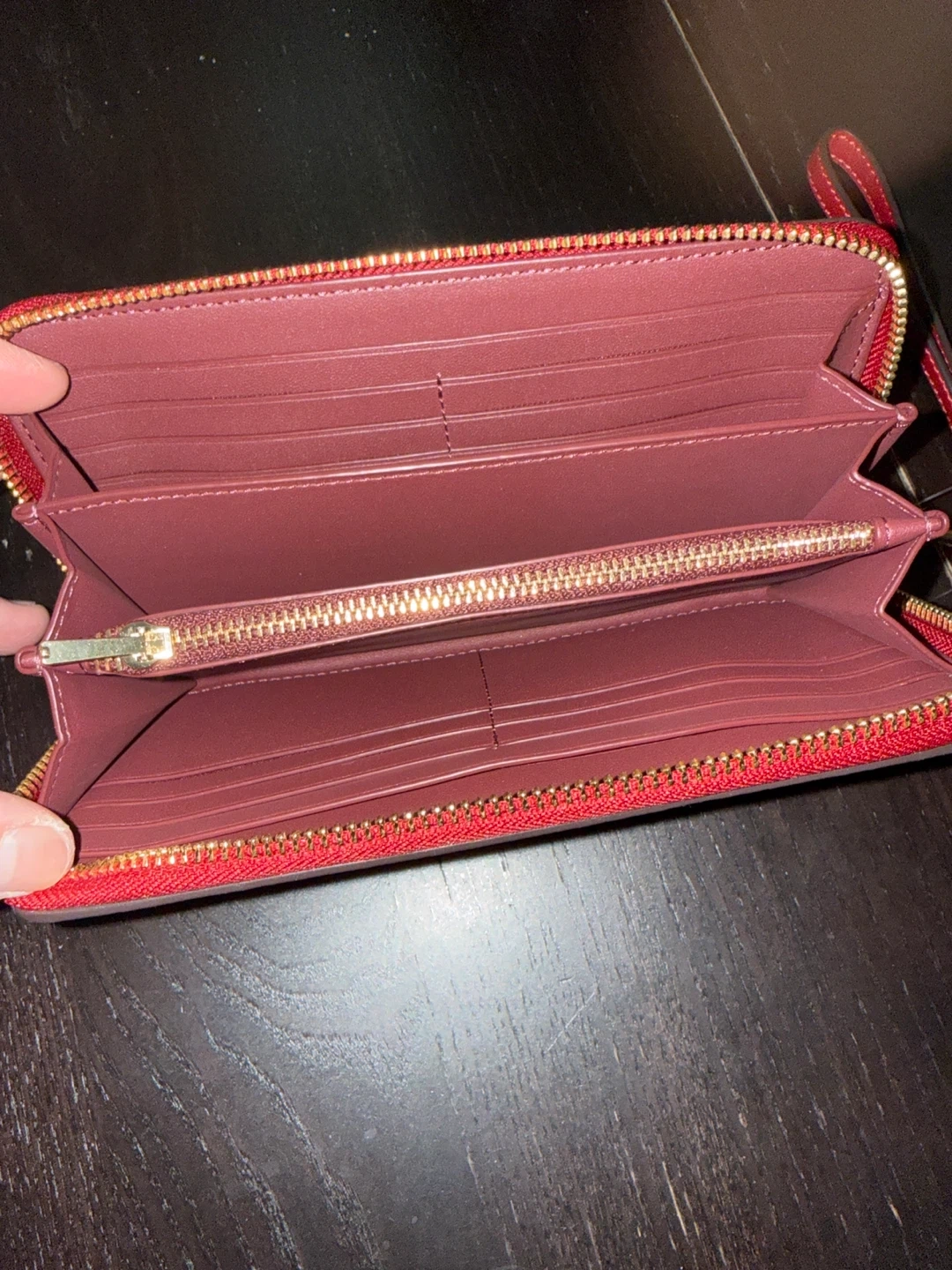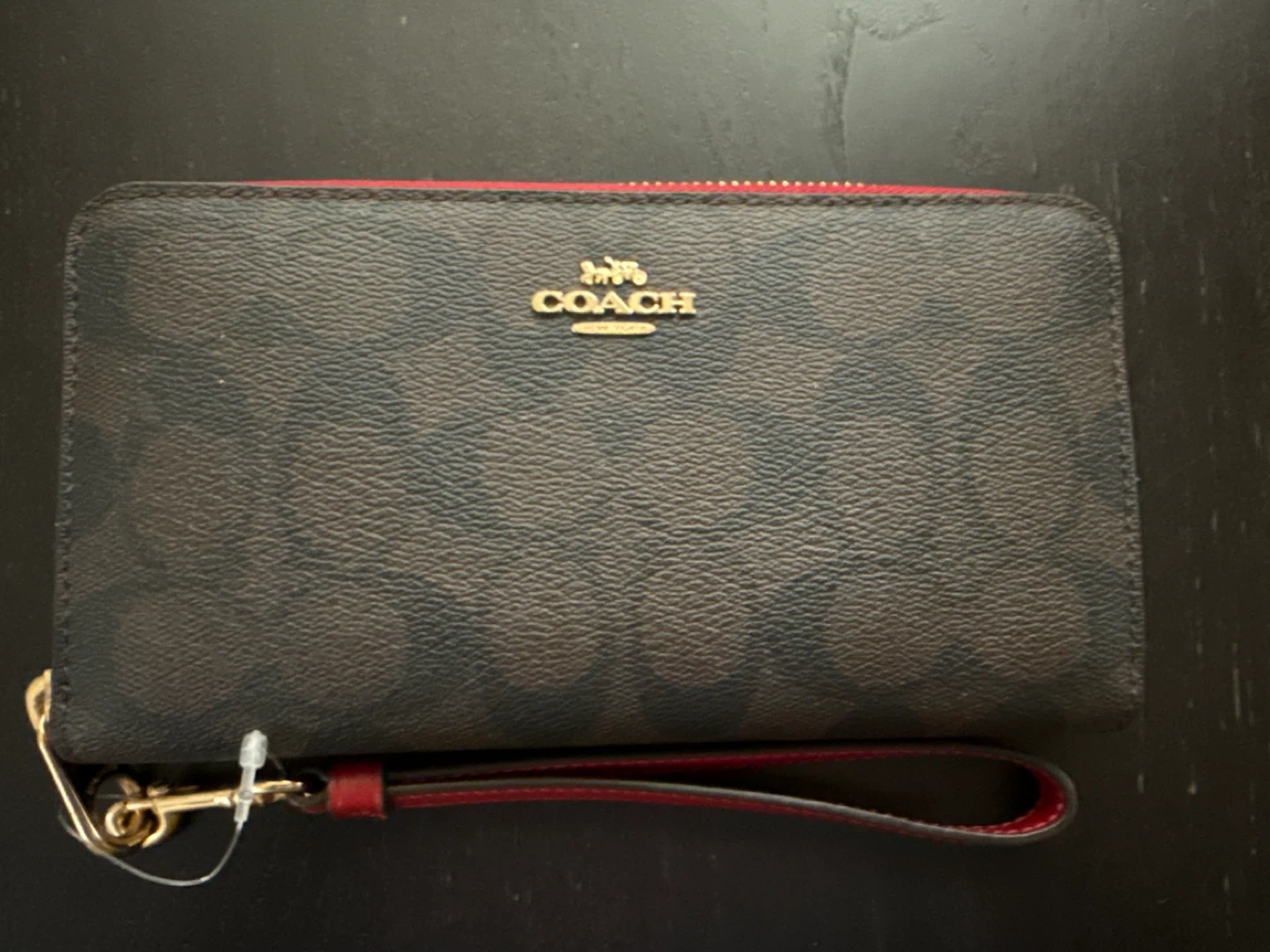 This Coach wristlet wallet features the signature C pattern with a red interior and wrist strap. It has multiple card slots and a zippered coin pocket. It's a stylish way to carry your essentials!