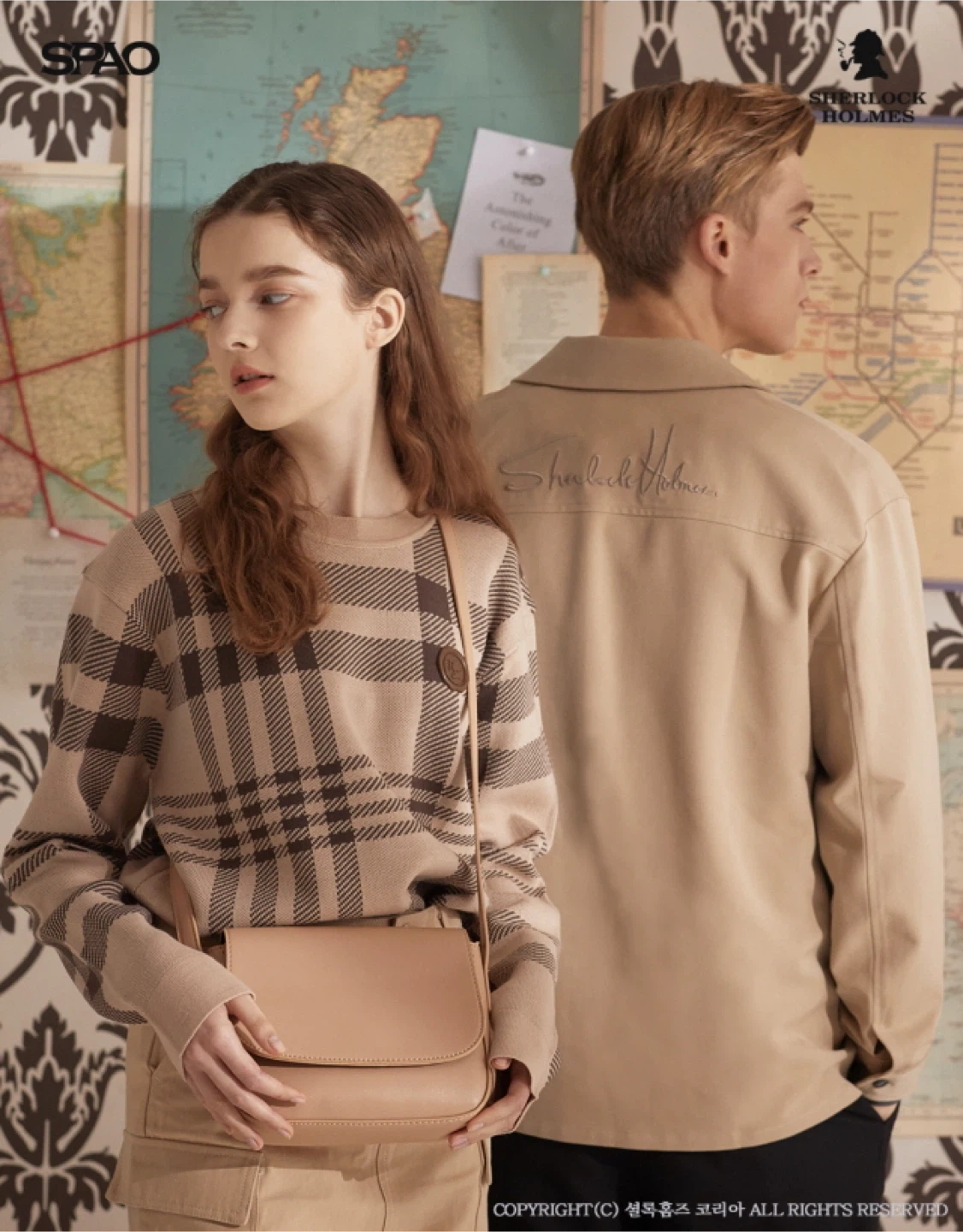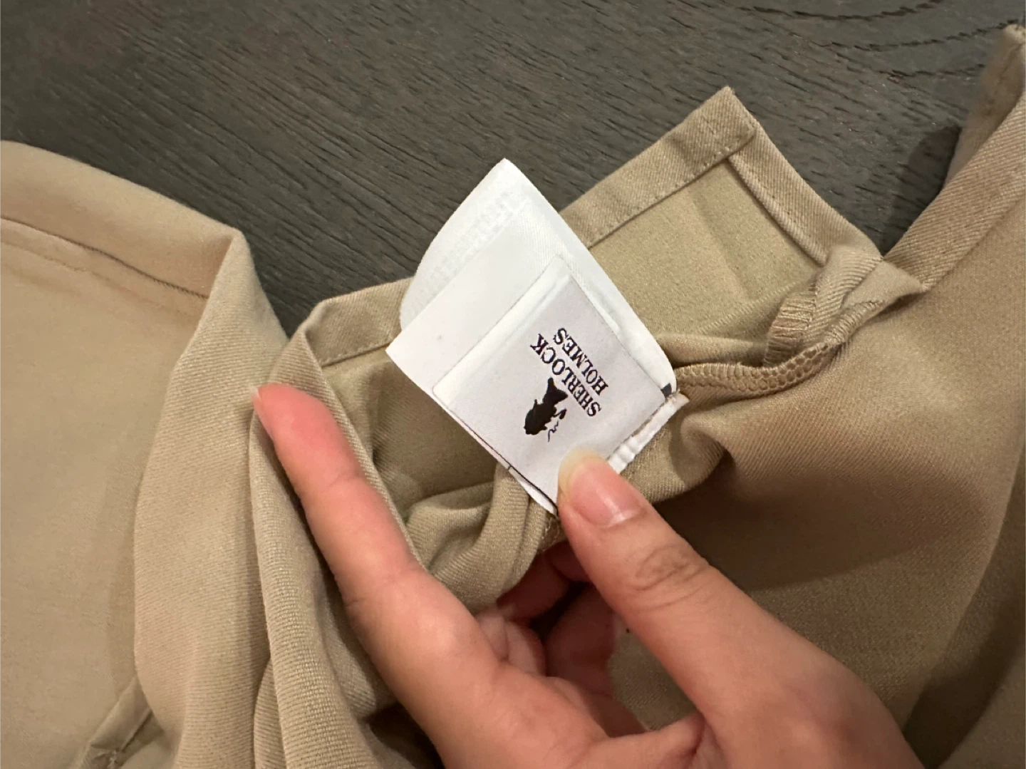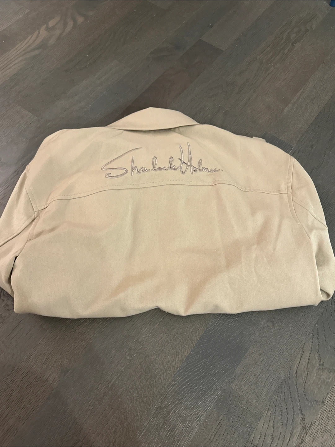 Selling a SPAO Sherlock Holmes jacket in a beige color. It features a button-up front and two chest pockets. The back has "Sherlock Holmes" embroidered on it. Great for fans of the series or anyone looking for a stylish and unique π§₯ (Made in Korea)