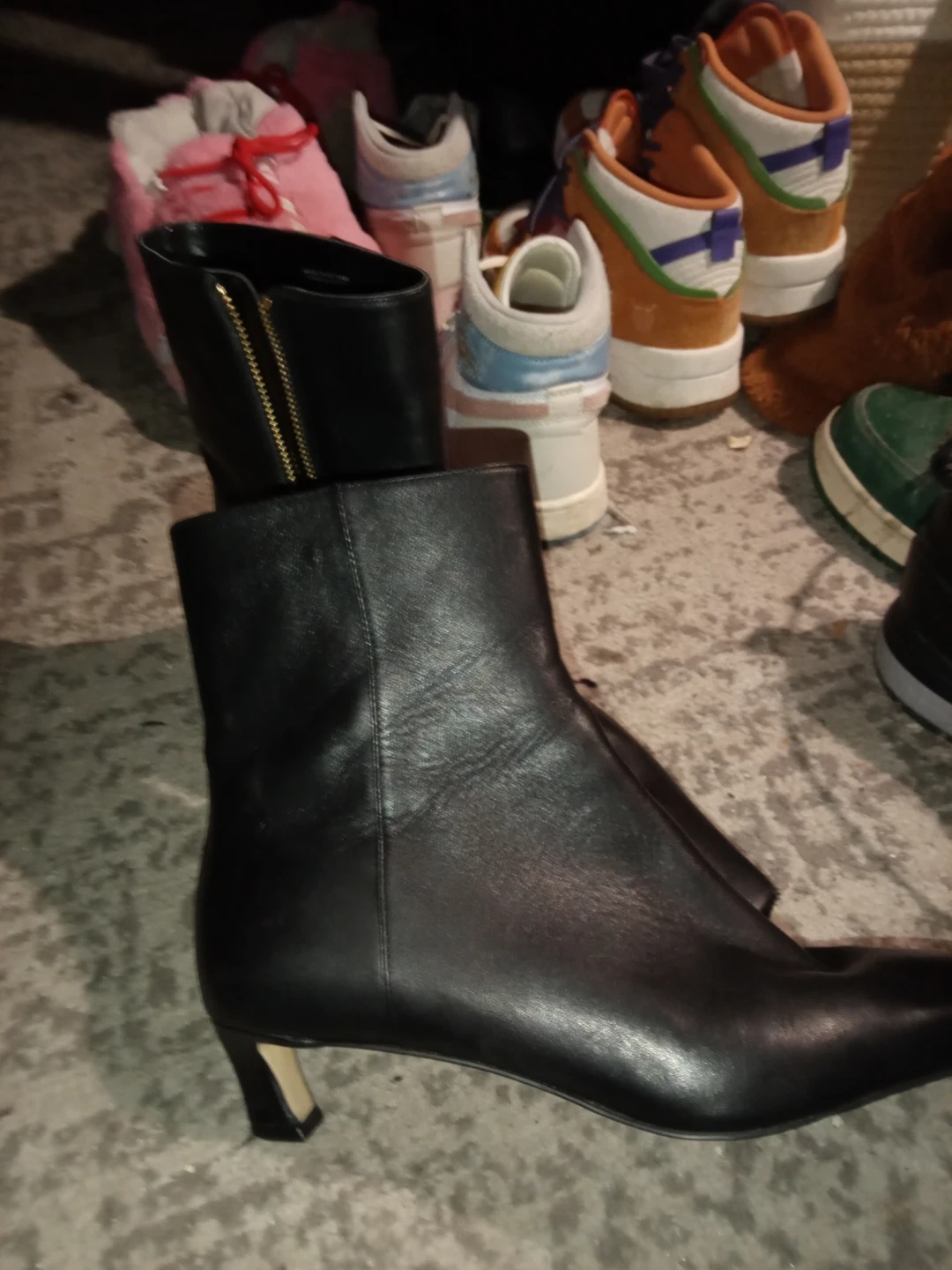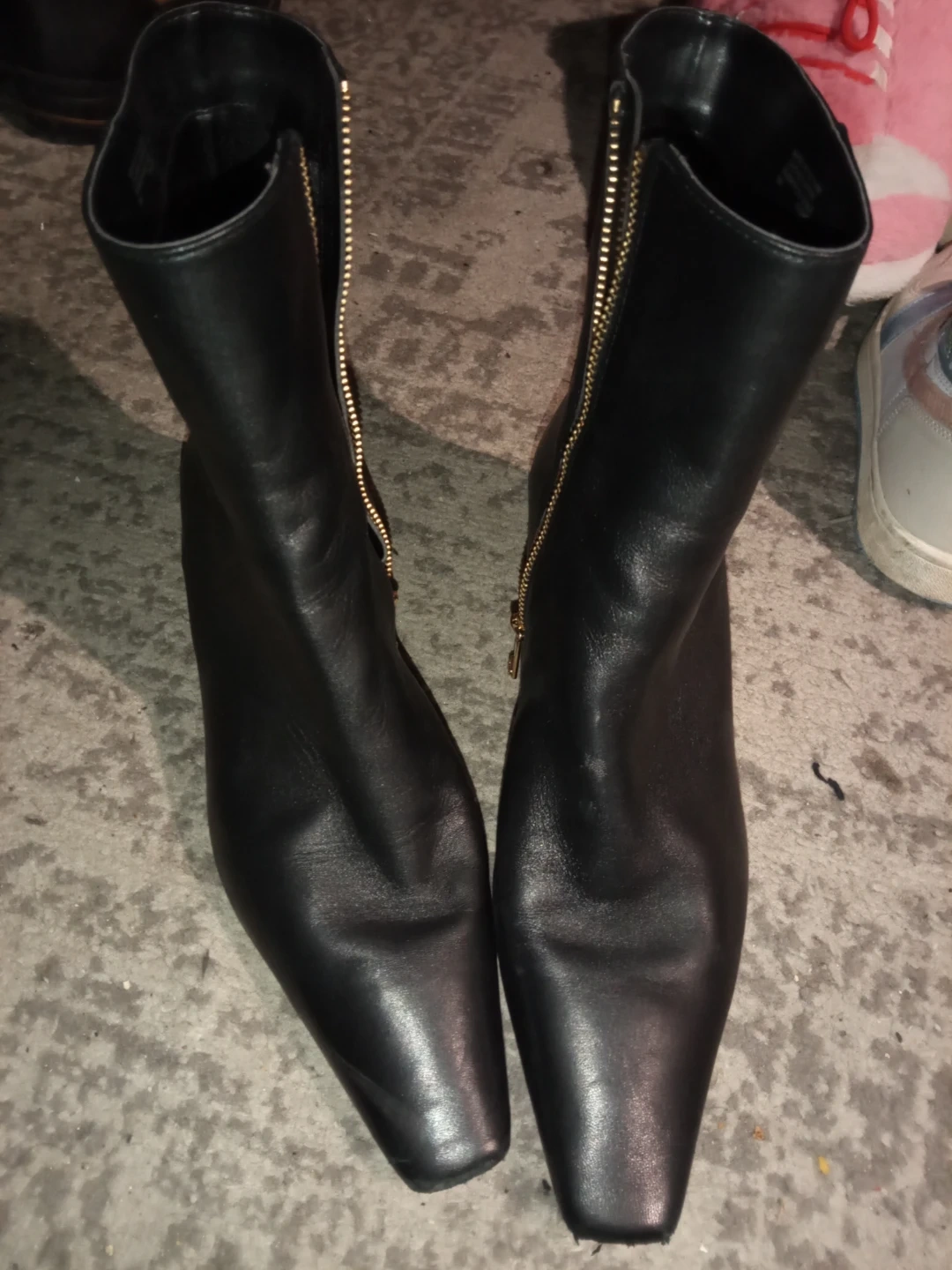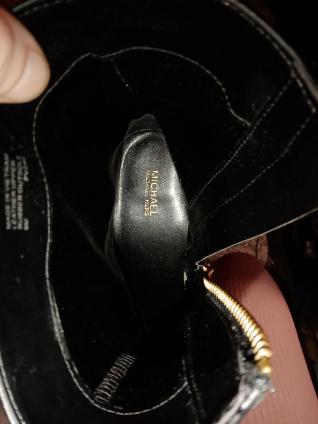These Michael Kors ankle boots are black with a leather upper and rubber outsole. They feature a side zipper and a pointed toe with a block heel. Size is 9.