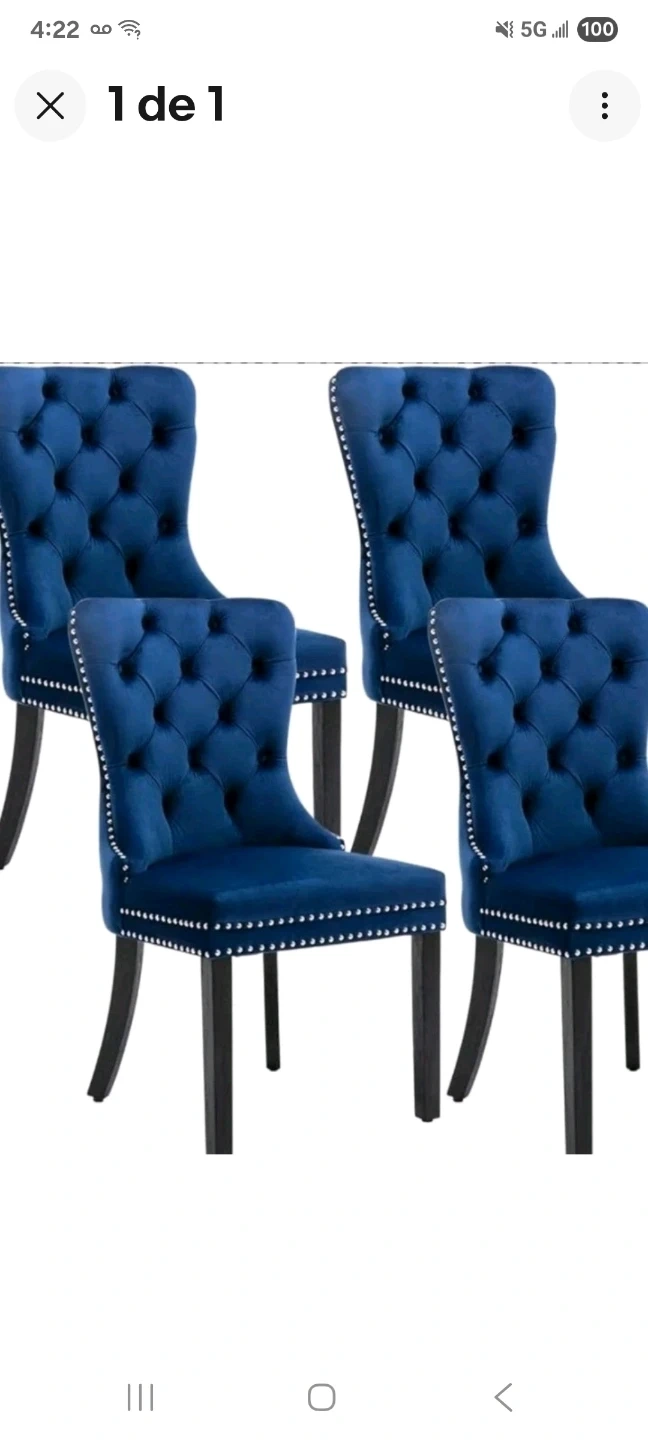 These dining chairs feature a rich blue velvet upholstery with elegant tufting and silver nailhead trim. They're built with sturdy wooden legs for stability. Perfect for adding a touch of sophistication to any dining room!