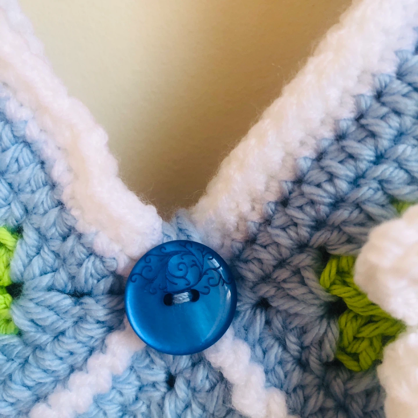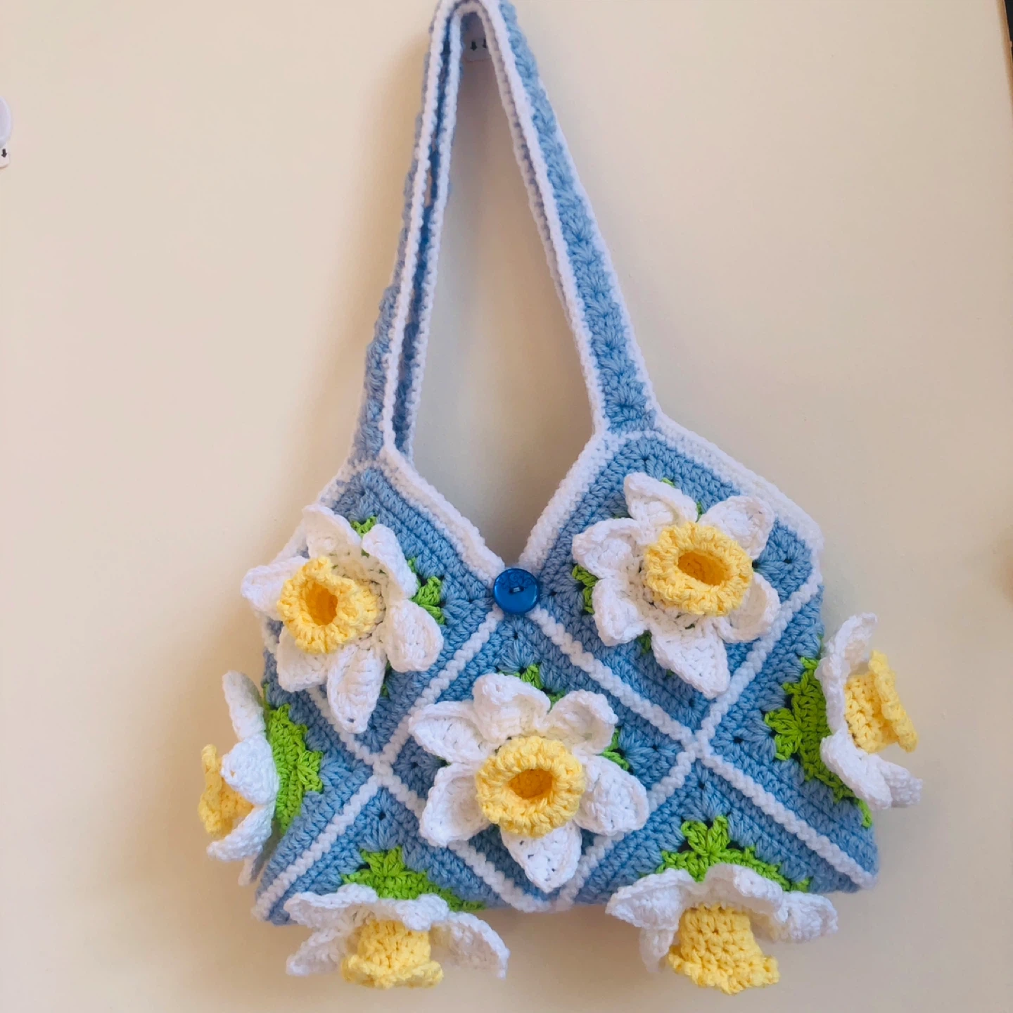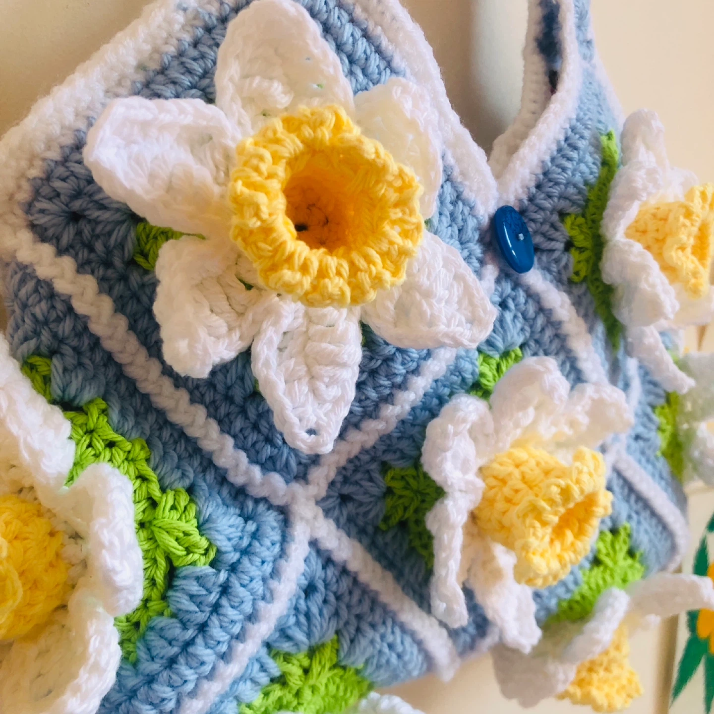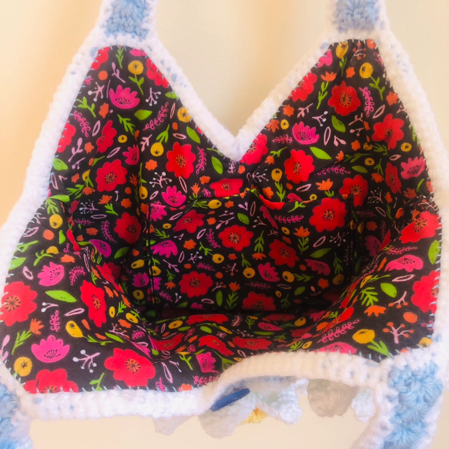 Sweet crochet tote bag adorned with daffodils. It features a patterned fabric lining inside and a single blue button closure.