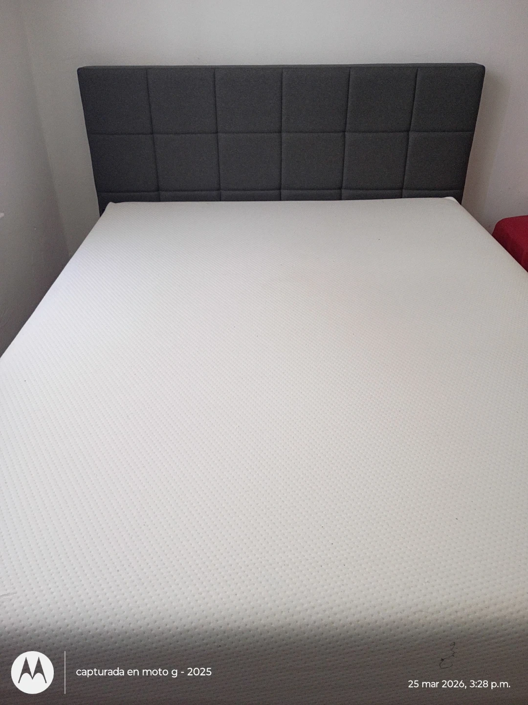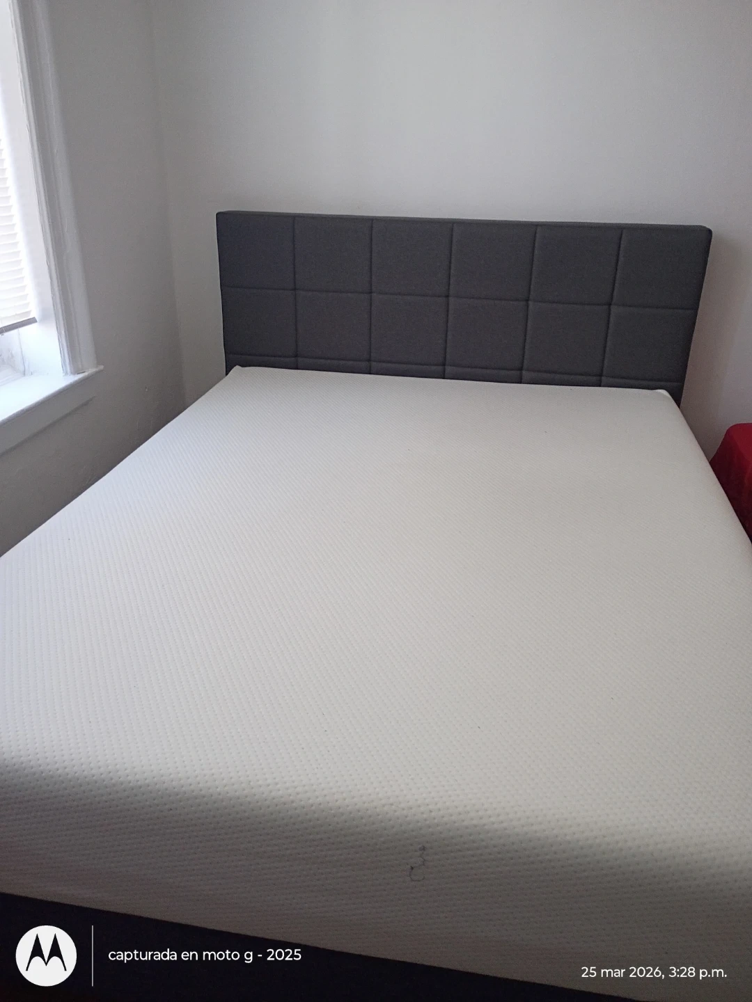 Selling a queen-size mattress and a dark gray upholstered headboard. The mattress has a white textured cover. Headboard features a tufted design with square panels, little negotiable