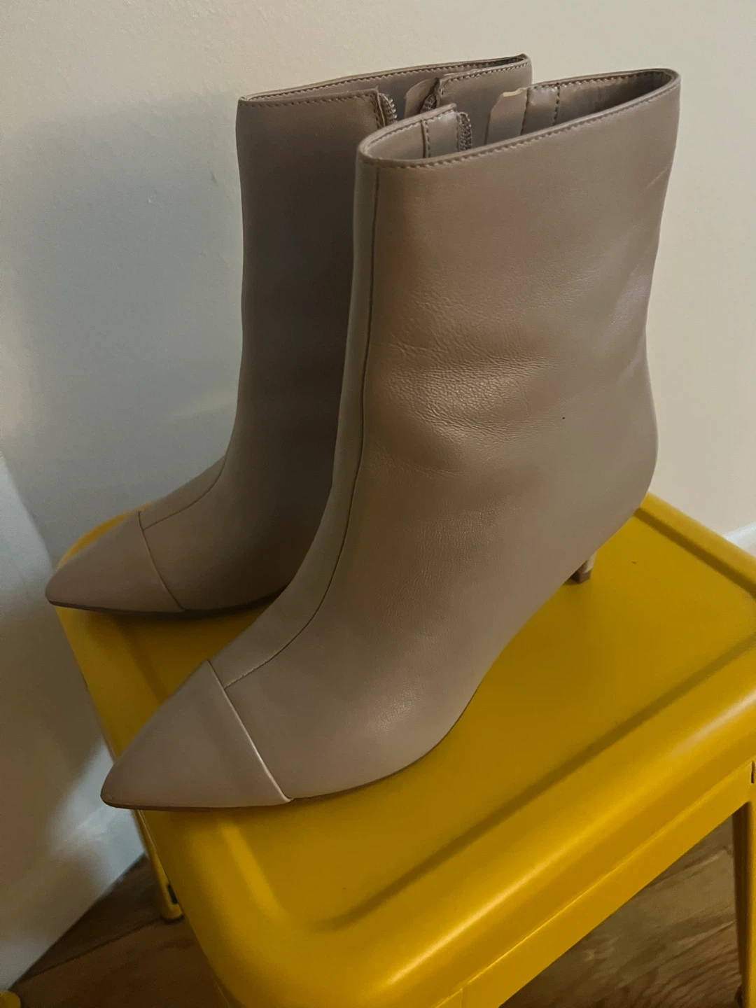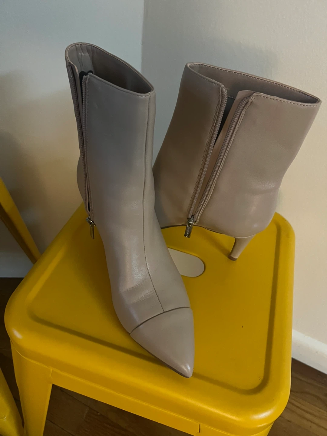 These are Calvin Klein booties in a neutral color. They feature a pointed toe and a zipper closure. Perfect for adding a touch of sophistication to any outfit!