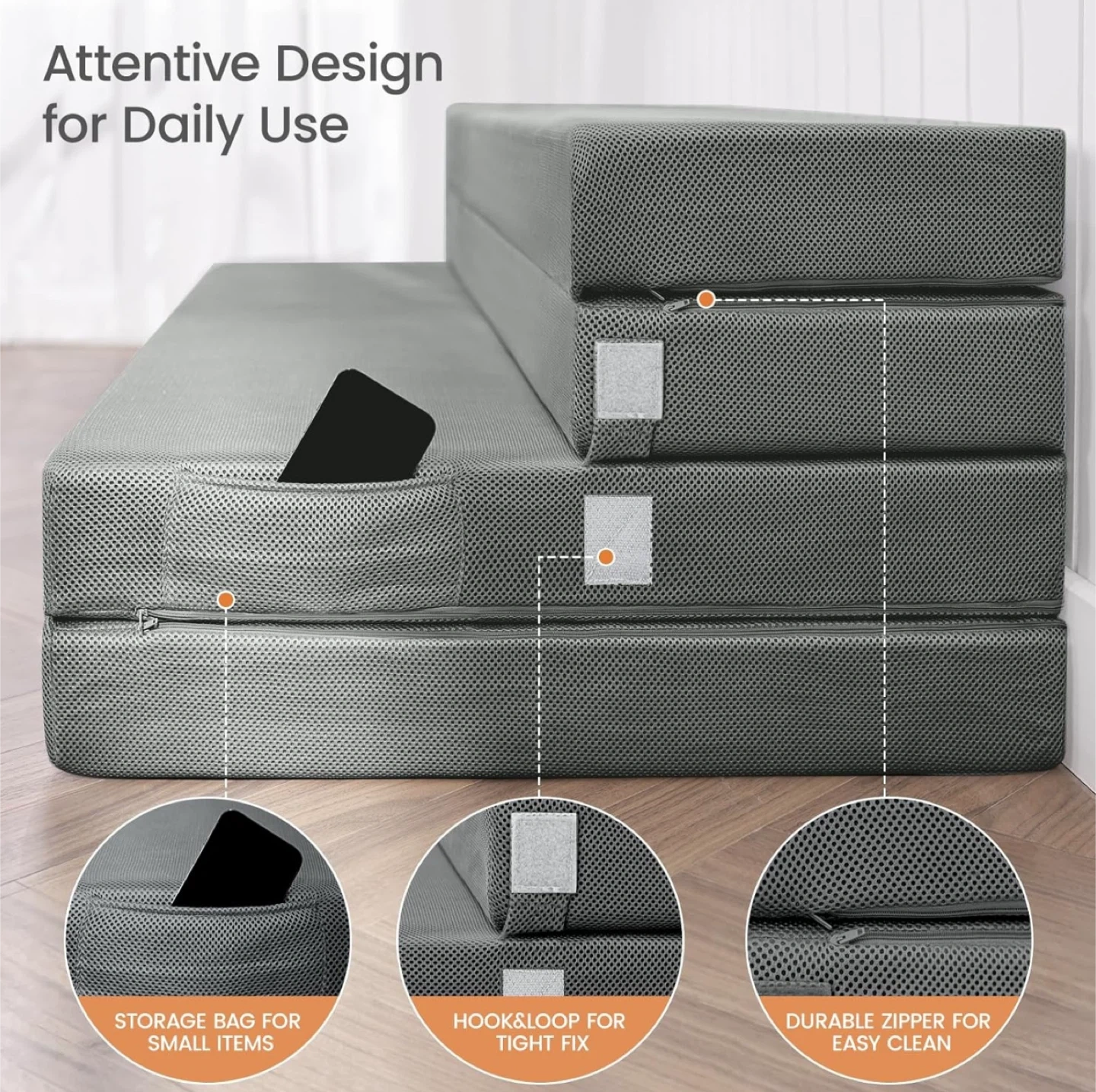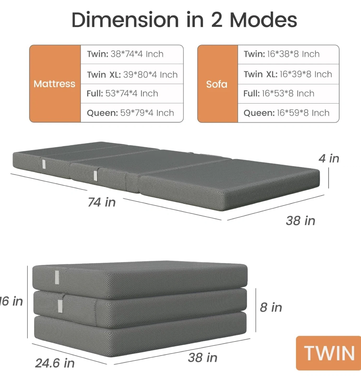 Selling a Milliard Tri-Fold Mattress in Twin size! It's in great shape and super convenient for guests or small spaces. When folded, it's 16" x 39" x 25", and when open, it's 39" x 75" x 4". Comes with its own carrying case for easy storage and transport
